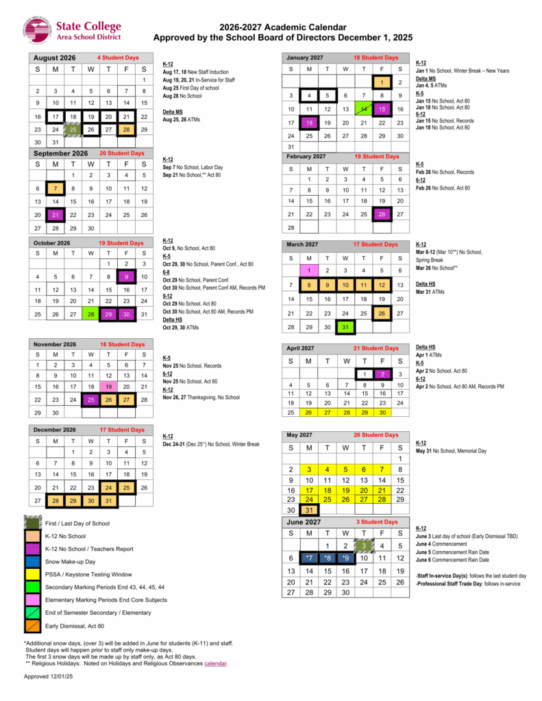 Pennsylvania, School Calendars, StatesState College Area School District 26-27 Calendar Updated [PDF]
