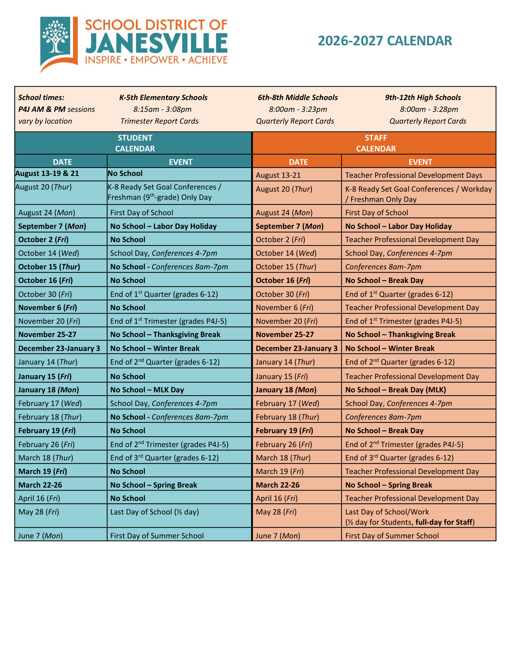 August 17-18, 2026Staff Development – No School