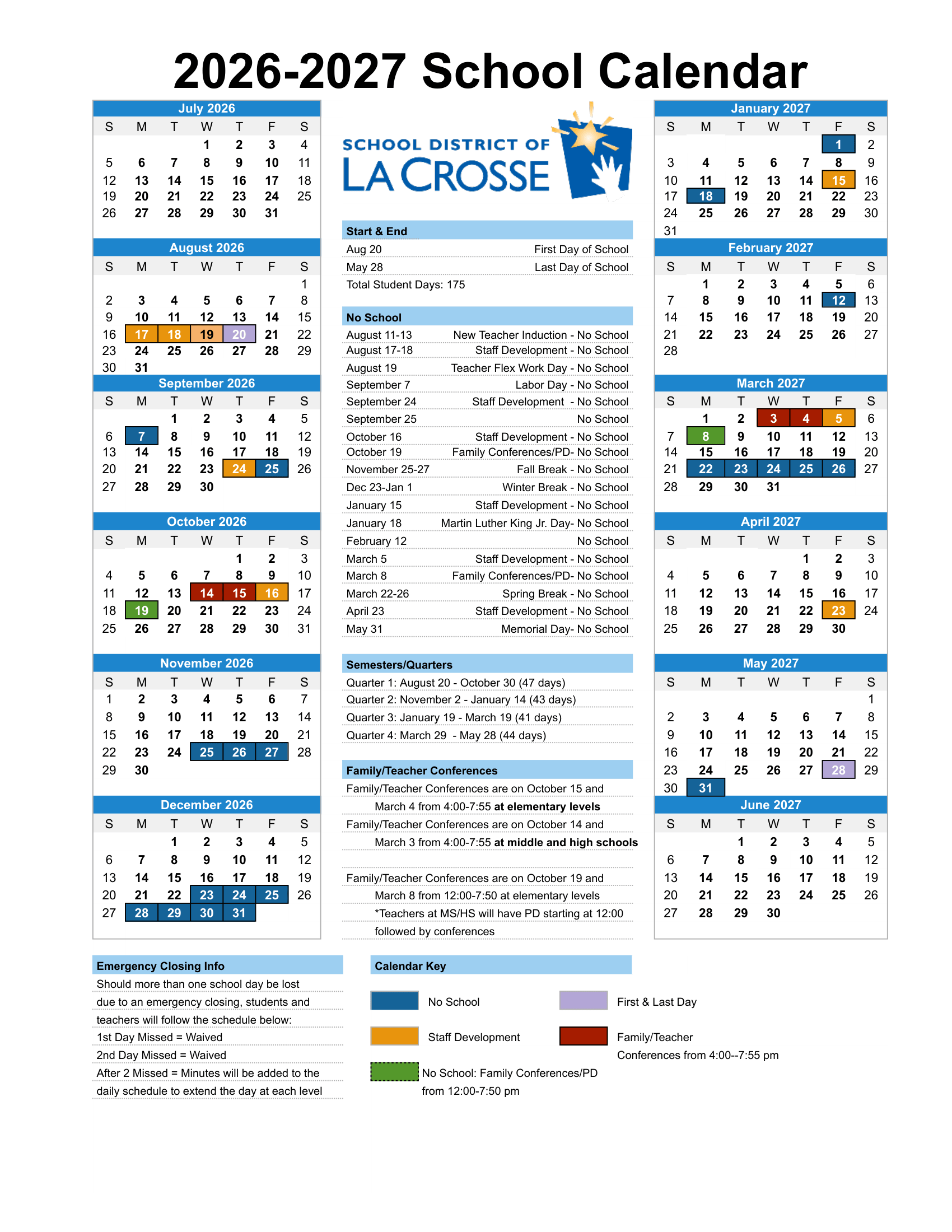 Dates are sourced from the official School District of LaCrosse Calendar 26-27 Updates website. Dates may change at the discretion of the district. Always verify with the official school website for the latest updates.