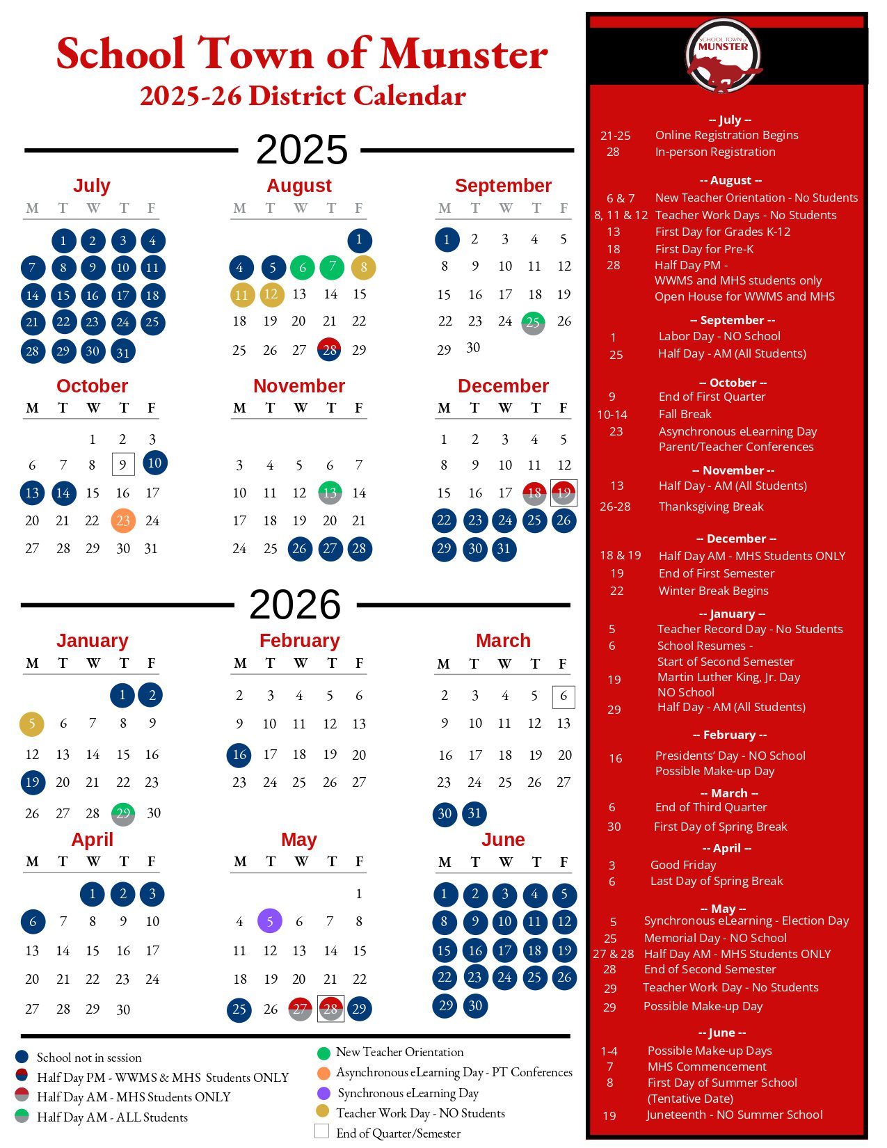 The printable school calendar provided on this page is taken from the official School Town of Munster Calendar website. Please note that all dates and events are subject to change at the discretion of the school district. For the most accurate and updated information, please refer to the official district website or contact the school helpline.