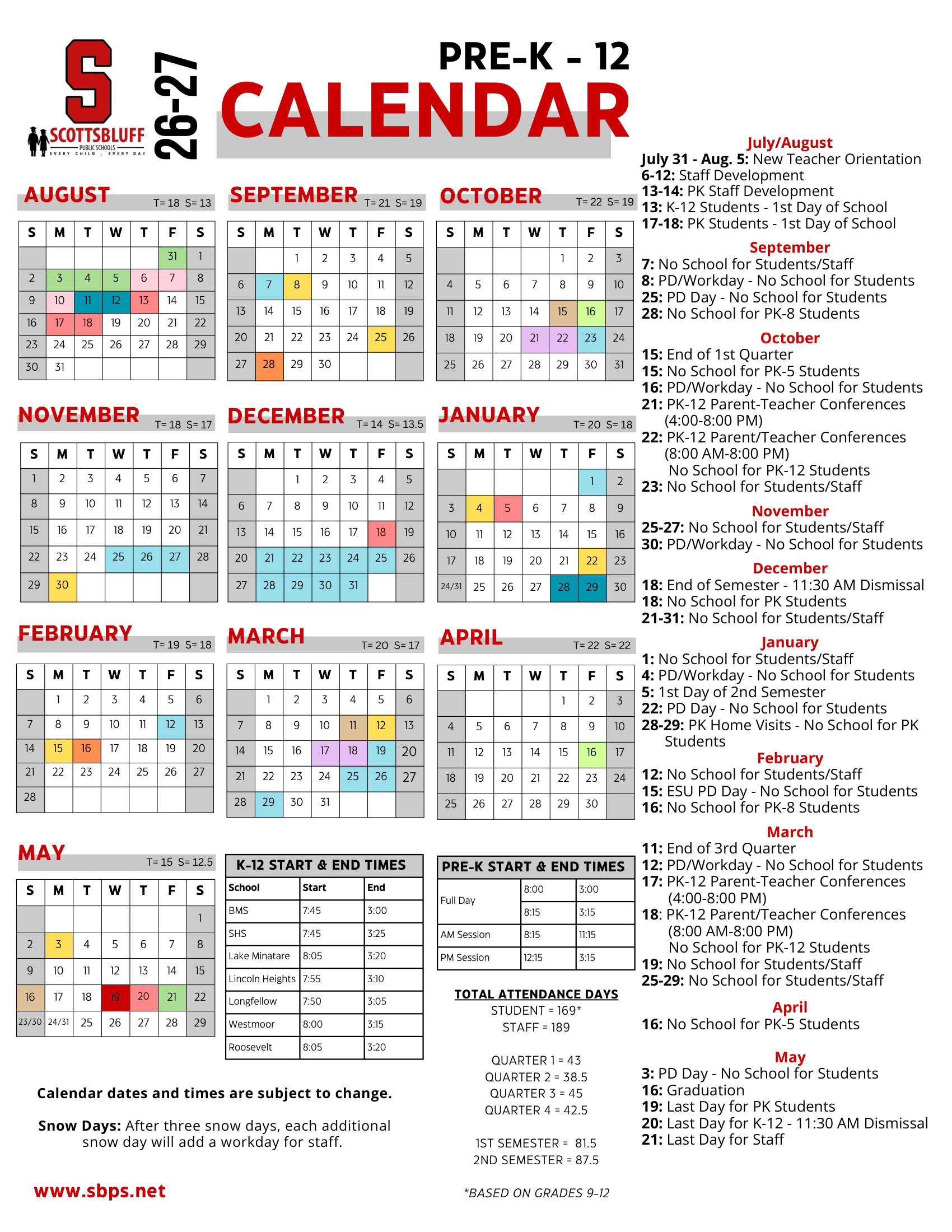 Dates are sourced from the official Scottsbluff Public Schools 26-27 Revised [PDF] website. Dates may change at the discretion of the district. Always verify with the official school website for the latest updates.