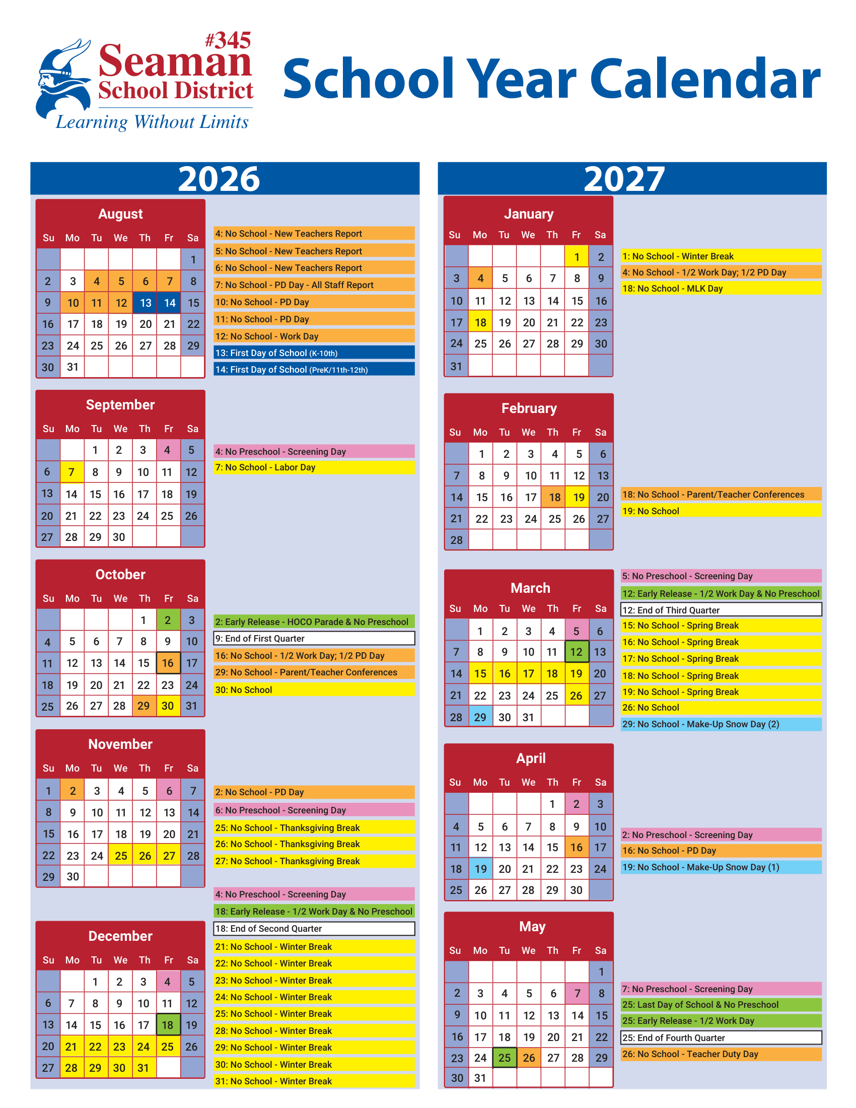 Dates are sourced from the official Seaman School District #345 26-27 Calendar Updated website. Dates may change at the discretion of the district. Always verify with the official school website for the latest updates.