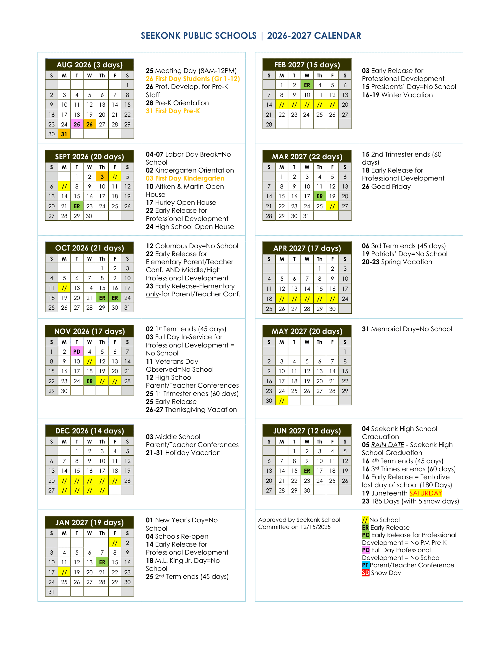 Dates are sourced from the official Seekonk Public Schools Calendar 26-27 Revised [PDF] website. Dates may change at the discretion of the district. Always verify with the official school website for the latest updates.