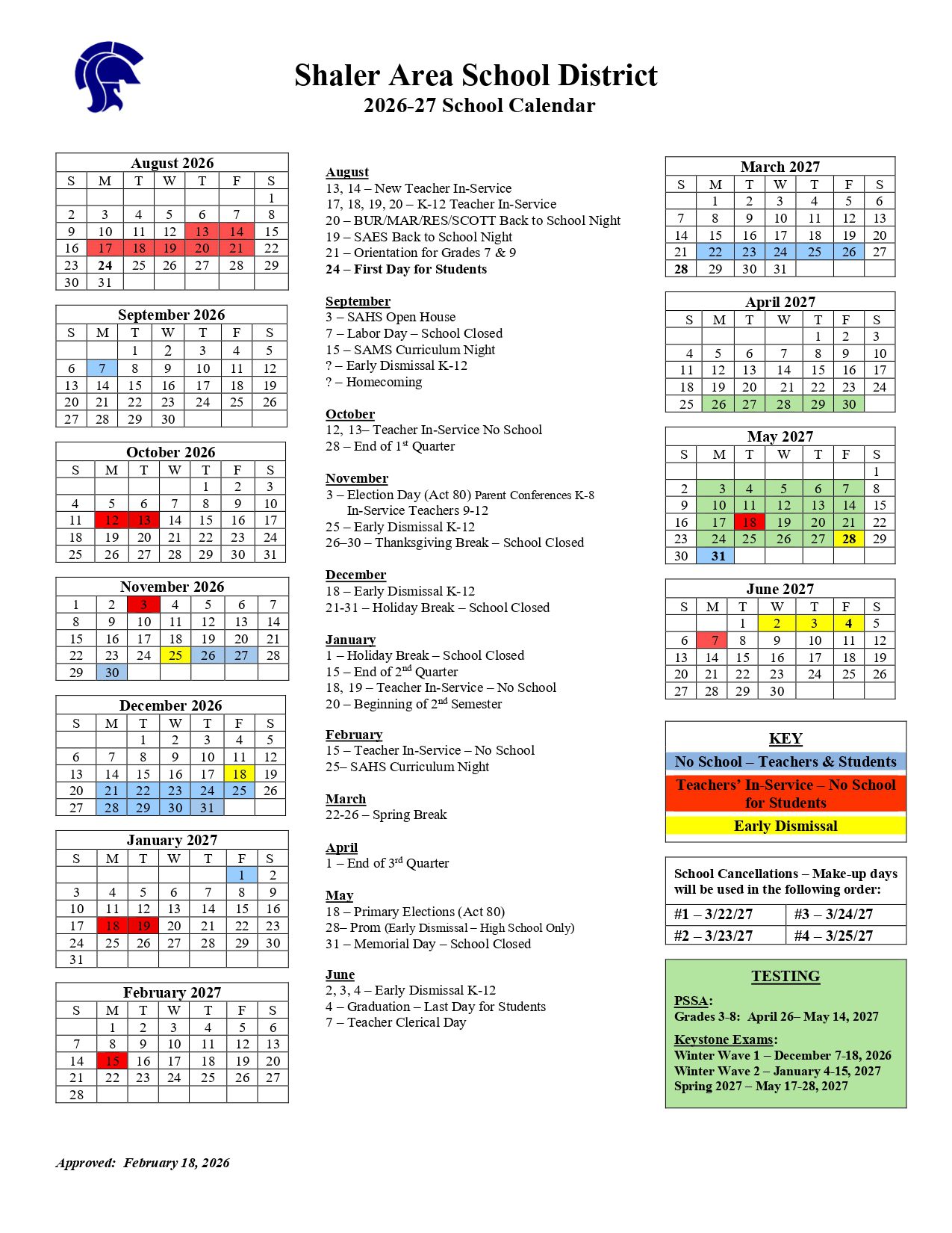 The Printable school calendar provided on this page is taken from the official Shaler Area School District PA Calendar 26-27 Updates. Please note that all dates and events are subject to change at the discretion of the school district. For the most accurate and updated information, please refer to the official district website or contact the school helpline.