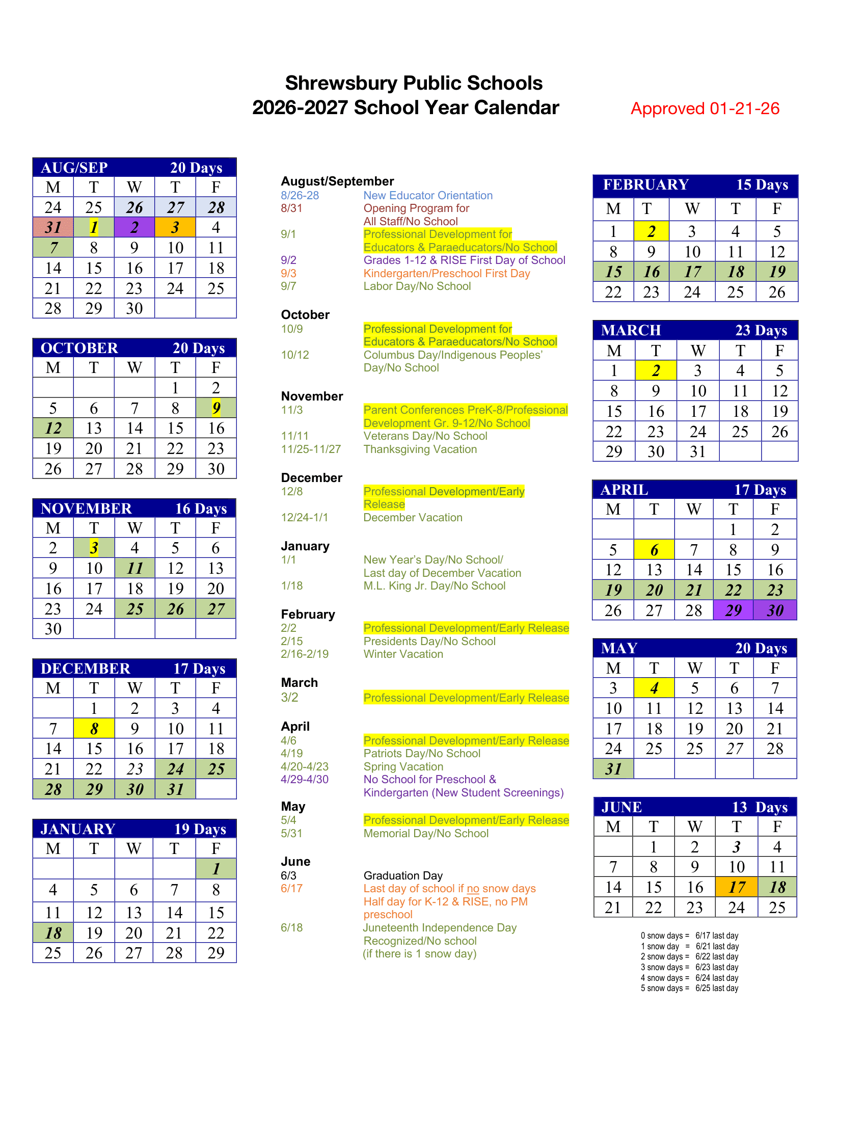 Dates are sourced from the official Shrewsbury Public Schools MA Calendar 26-27 Revised [PDF] website. Dates may change at the discretion of the district. Always verify with the official school website for the latest updates.