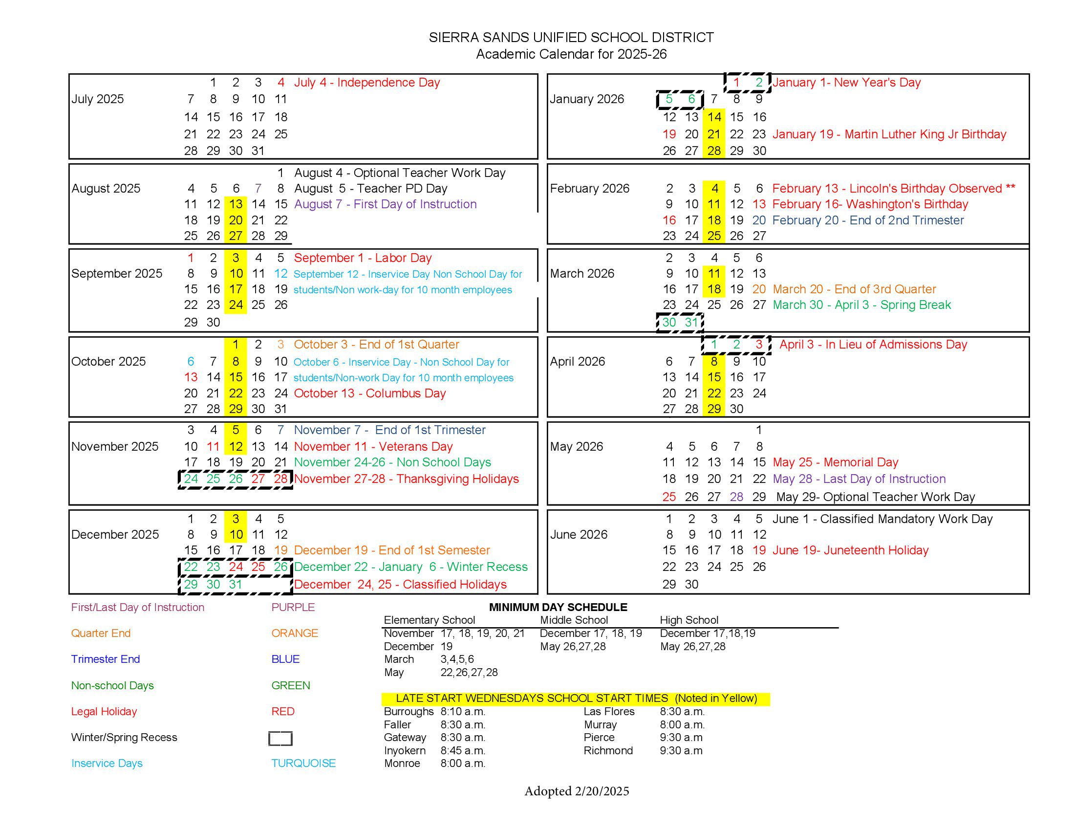 SIERRA SANDS UNIFIED SCHOOL DISTRICT Calendar (2025-2026)