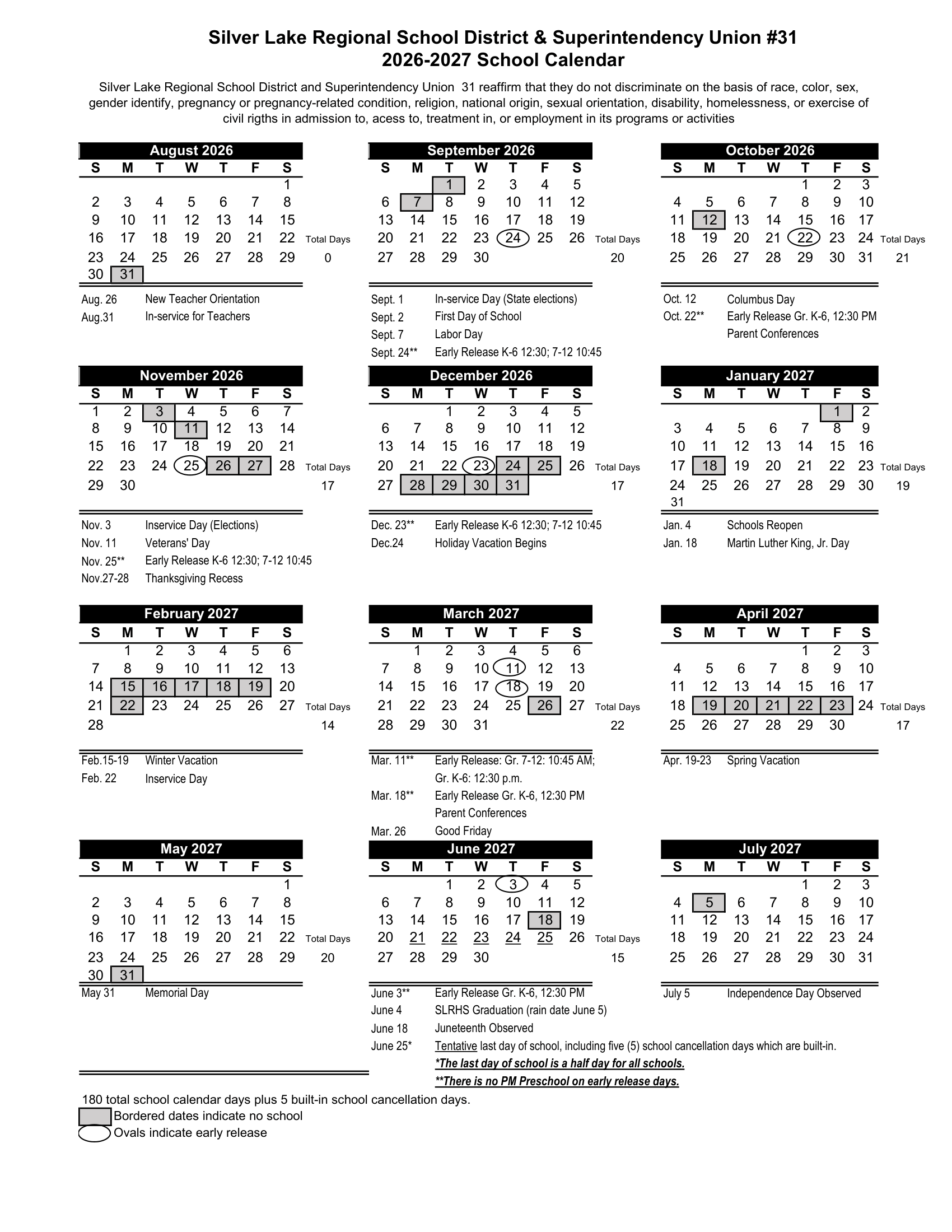 Silver Lake Regional School District & Superintendency Union #31 Calendar (2026-2027)