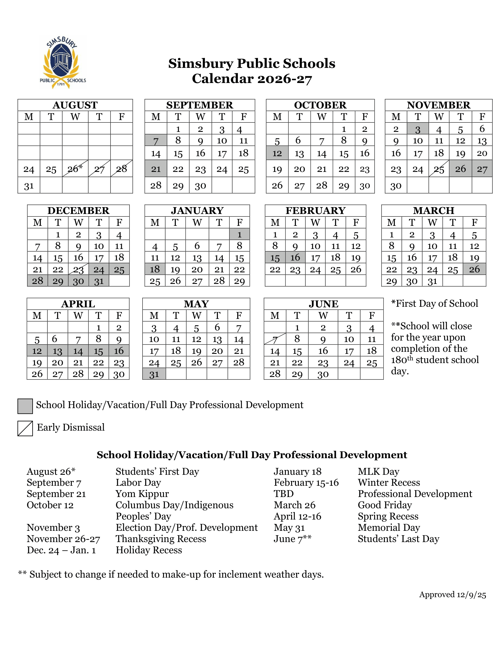 Dates are sourced from the official Simsbury Public Schools Calendar 26-27 Updated [PDF] website. Dates may change at the discretion of the district. Always verify with the official school website for the latest updates.