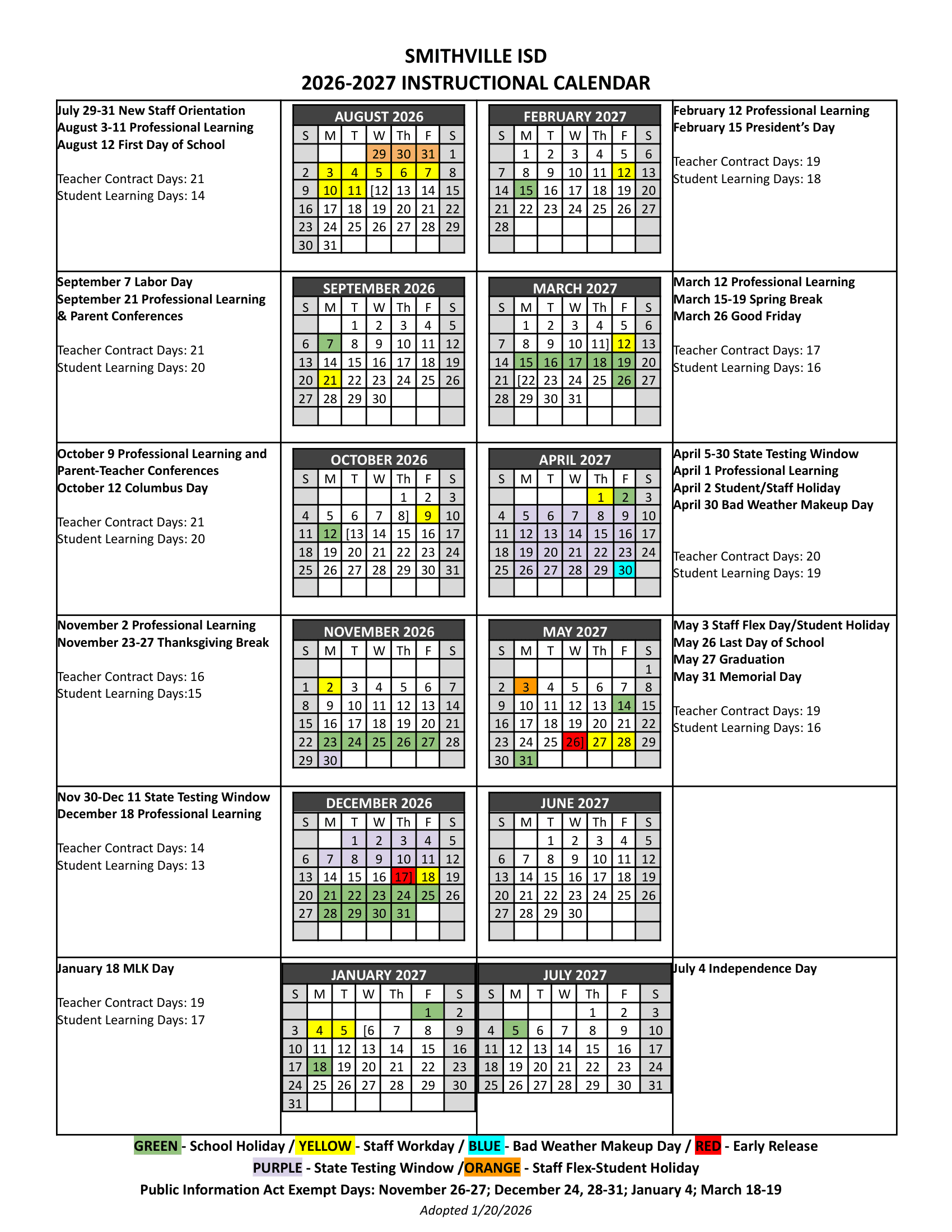 Dates are sourced from the official Smithville ISD Calendar 26-27 Revised[PDF] website. Dates may change at the discretion of the district. Always verify with the official school website for the latest updates.
