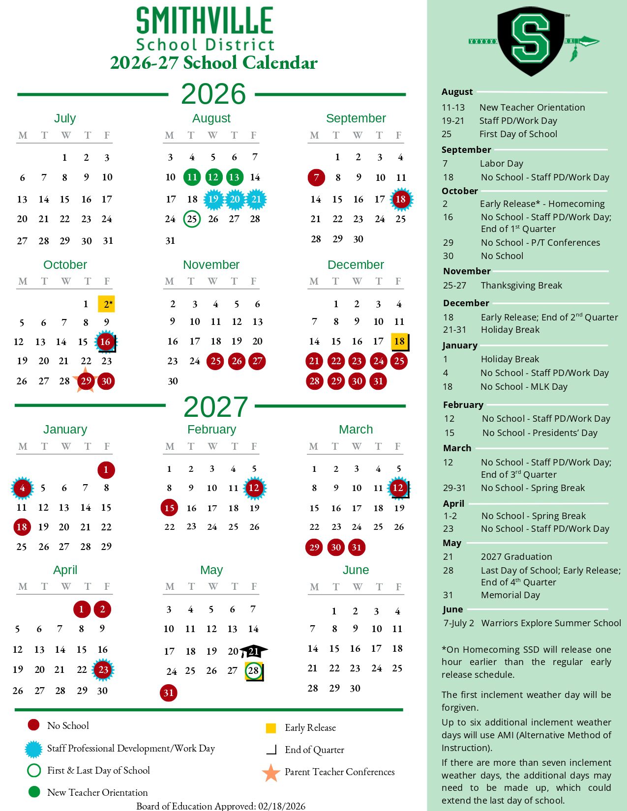 The Printable school calendar provided on this page is taken from the official Smithville School District Calendar 26-27 Updated. Please note that all dates and events are subject to change at the discretion of the school district. For the most accurate and updated information, please refer to the official district website or contact the school helpline.