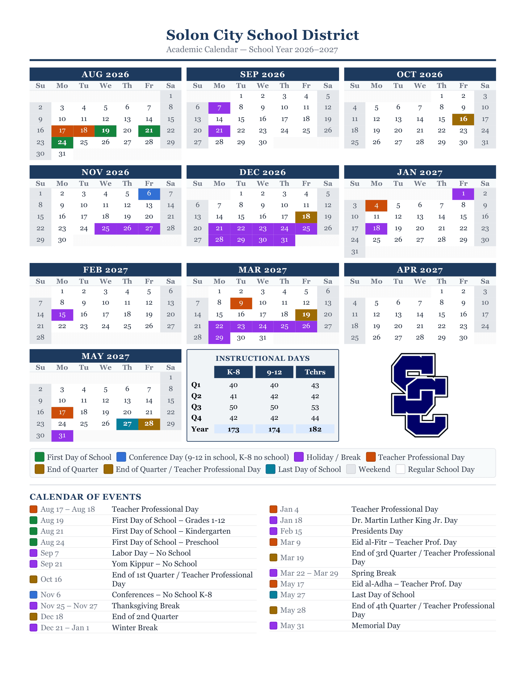 Dates are sourced from the official Solon City School District Calendar 26-27 Updates website. Dates may change at the discretion of the district. Always verify with the official school website for the latest updates.