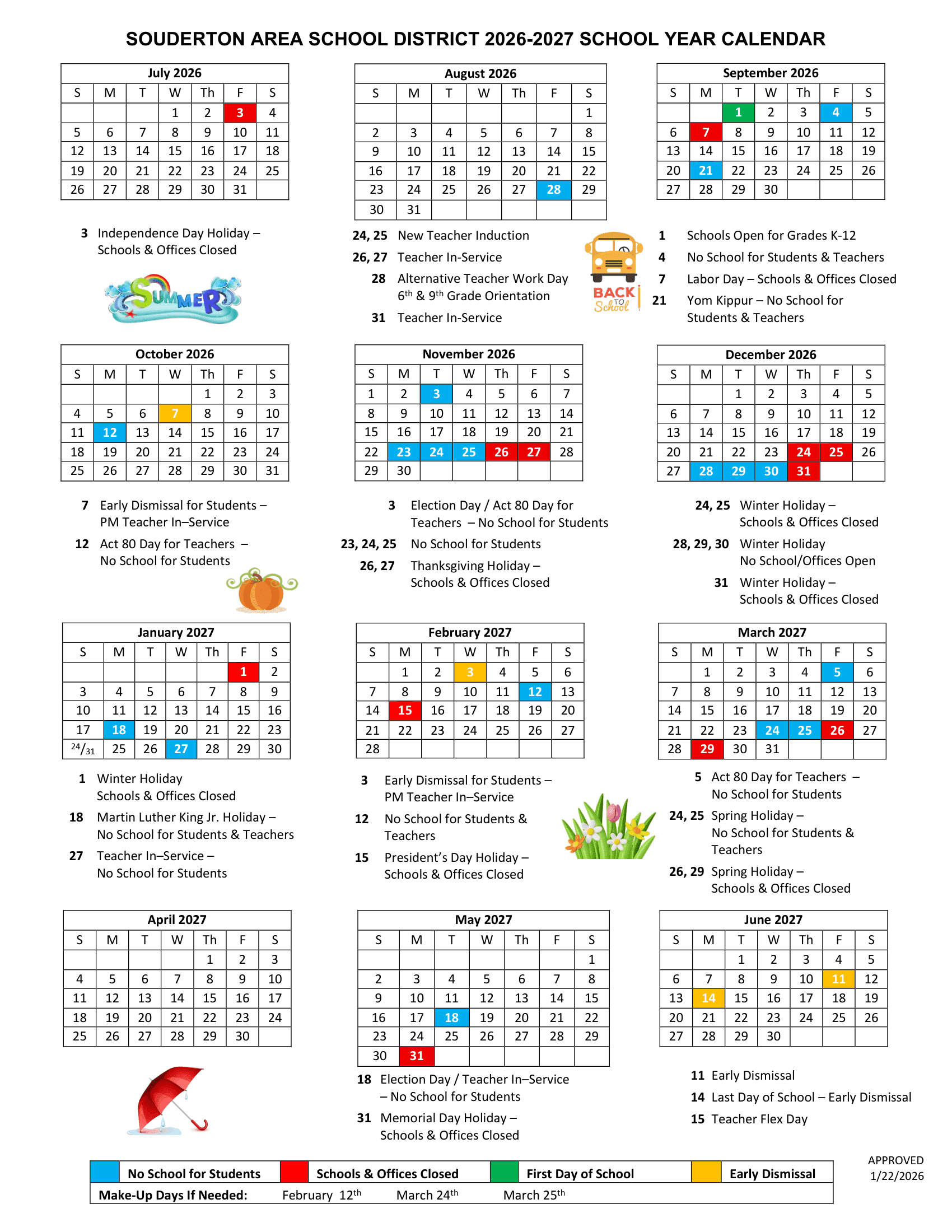 Dates are sourced from the official Souderton Area School District SASD 26-27 Calendar Updated [PDF] website. Dates may change at the discretion of the district. Always verify with the official school website for the latest updates.