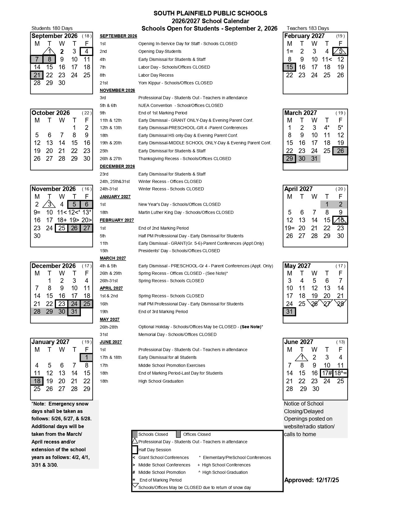 SOUTH PLAINFIELD PUBLIC SCHOOLS Calendar (2026-2027)