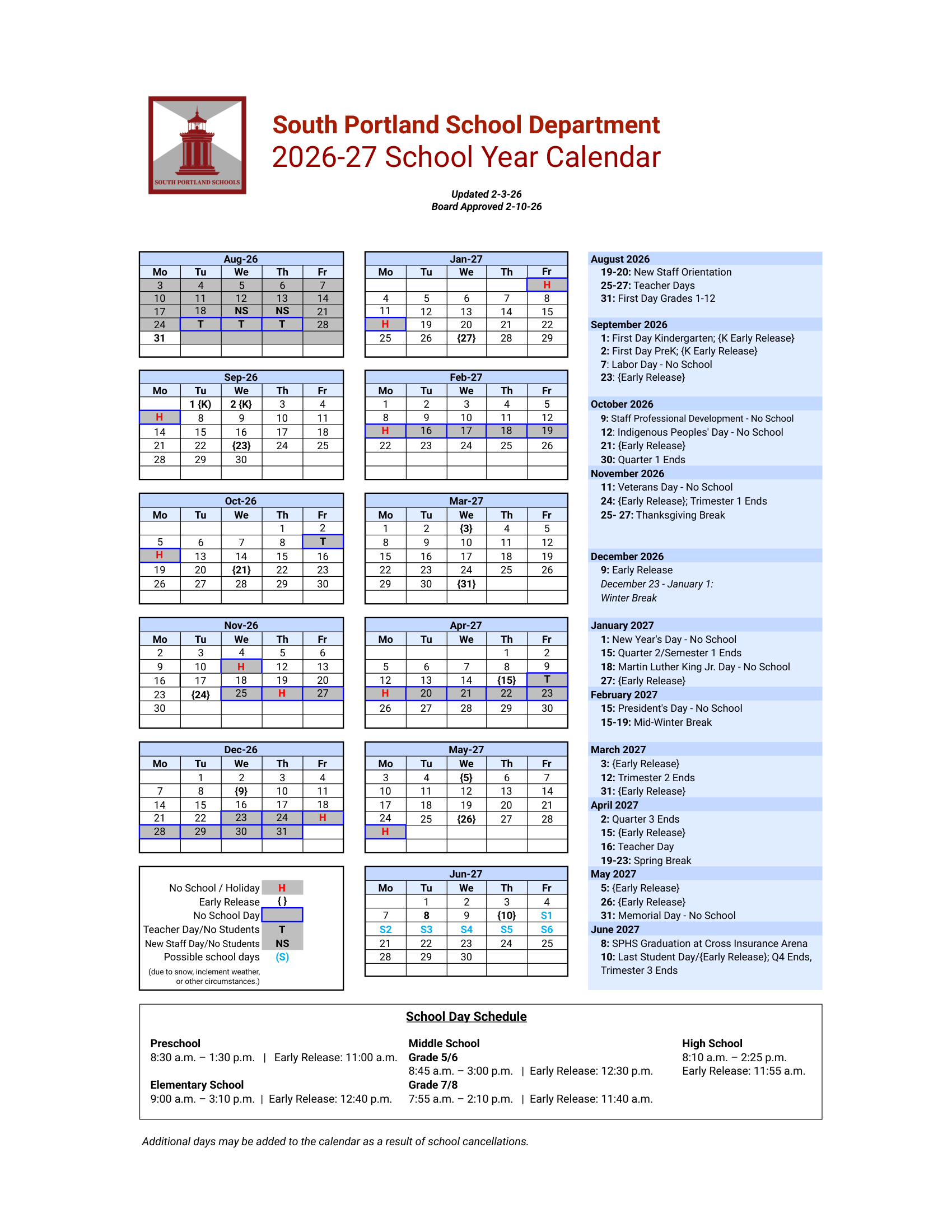 Dates are sourced from the official South Portland School Department Calendar 26-27 Revised [PDF] website. Dates may change at the discretion of the district. Always verify with the official school website for the latest updates.