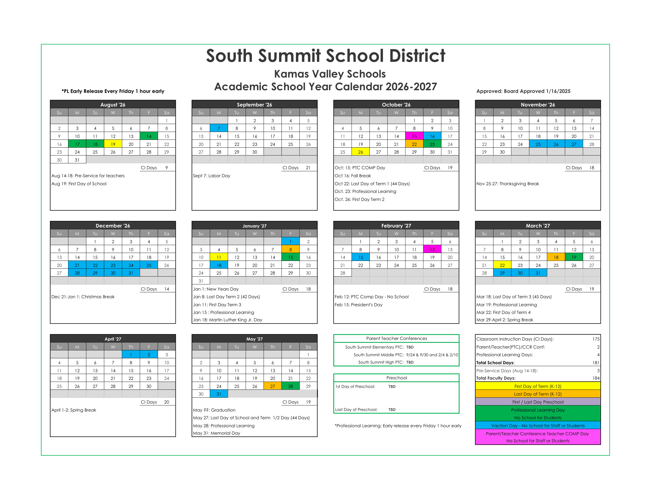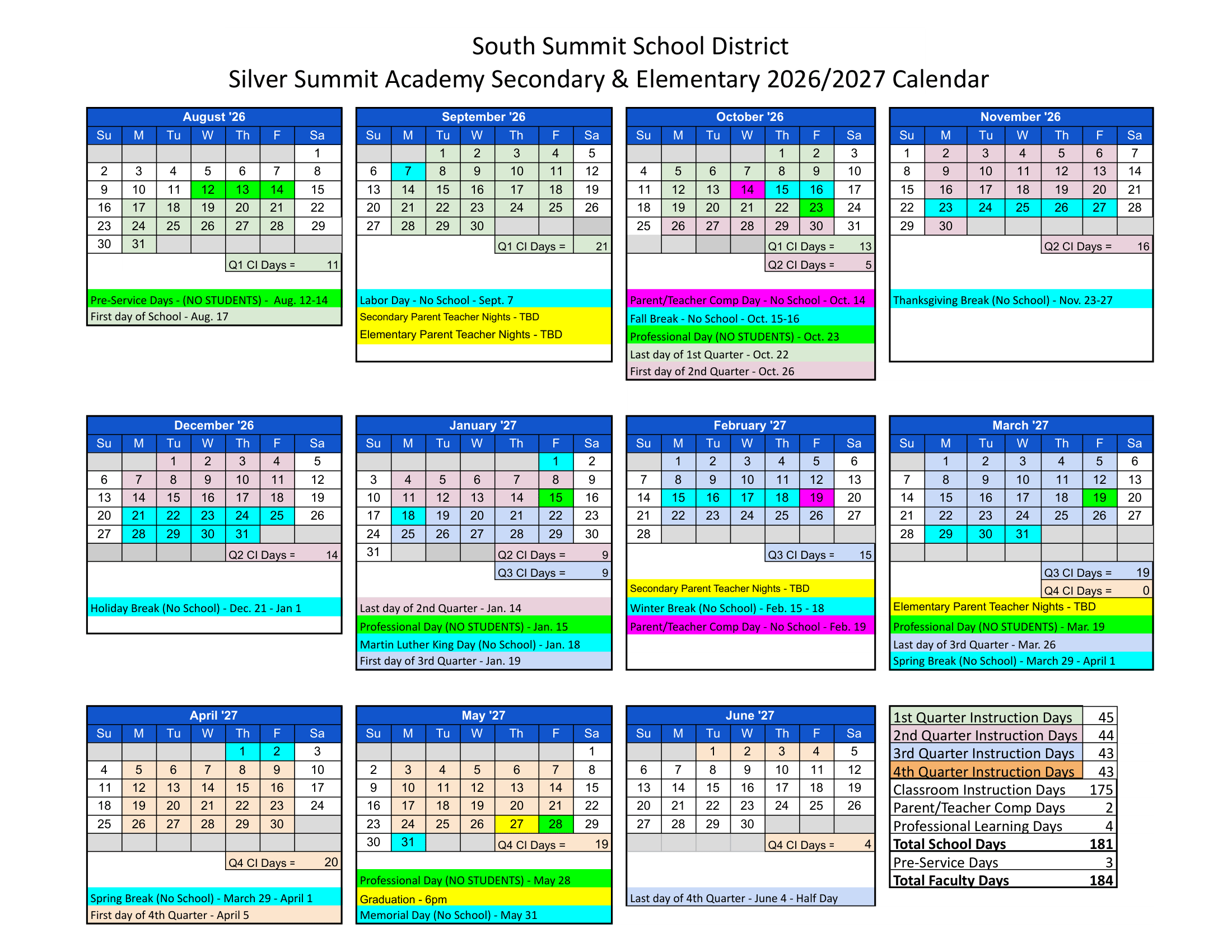 Dates are sourced from the official South Summit School District – Silver Summit Academy 26-27 Calendar Revised [PDF] website. Dates may change at the discretion of the district. Always verify with the official school website for the latest updates.