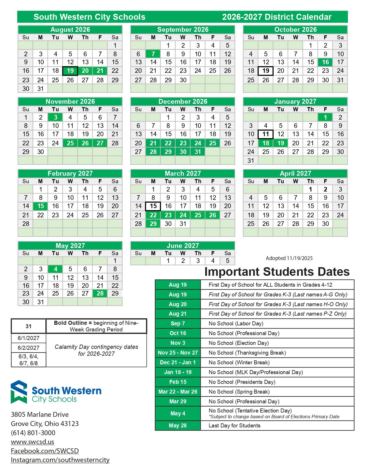 Dates are sourced from the official South Western City schools OH Calendar 26-27 Updates website. Dates may change at the discretion of the district. Always verify with the official school website for the latest updates.