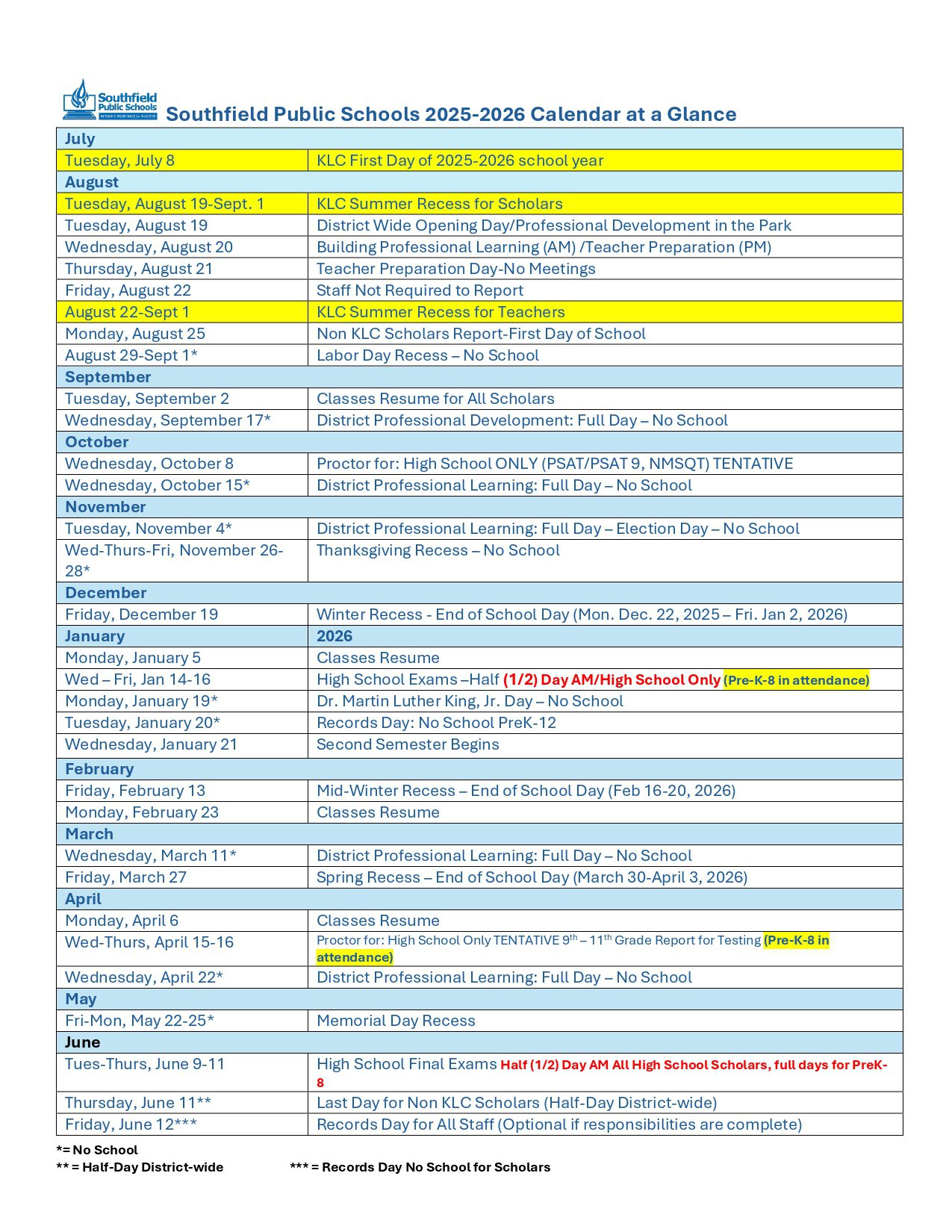 The school calendar provided on this page is taken from the official Southfield Public School District School District website. Please note that all dates and events are subject to change at the discretion of the school district. For the most accurate and updated information, please refer to the official district website or contact the school helpline.