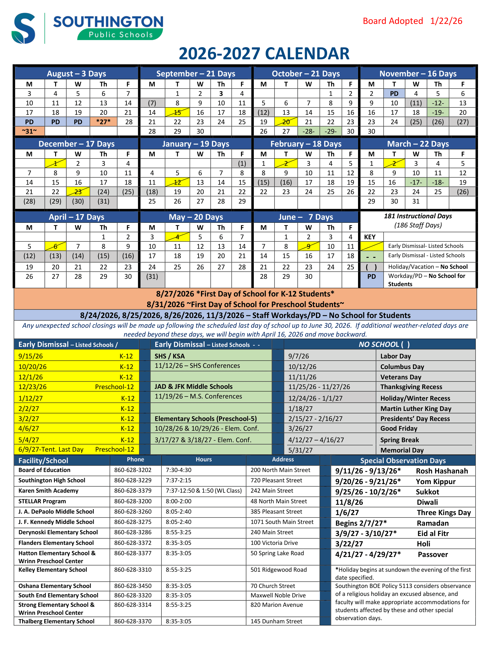 Dates are sourced from the official Southington Public Schools Calendar 26-27 Updated [PDF] website. Dates may change at the discretion of the district. Always verify with the official school website for the latest updates.