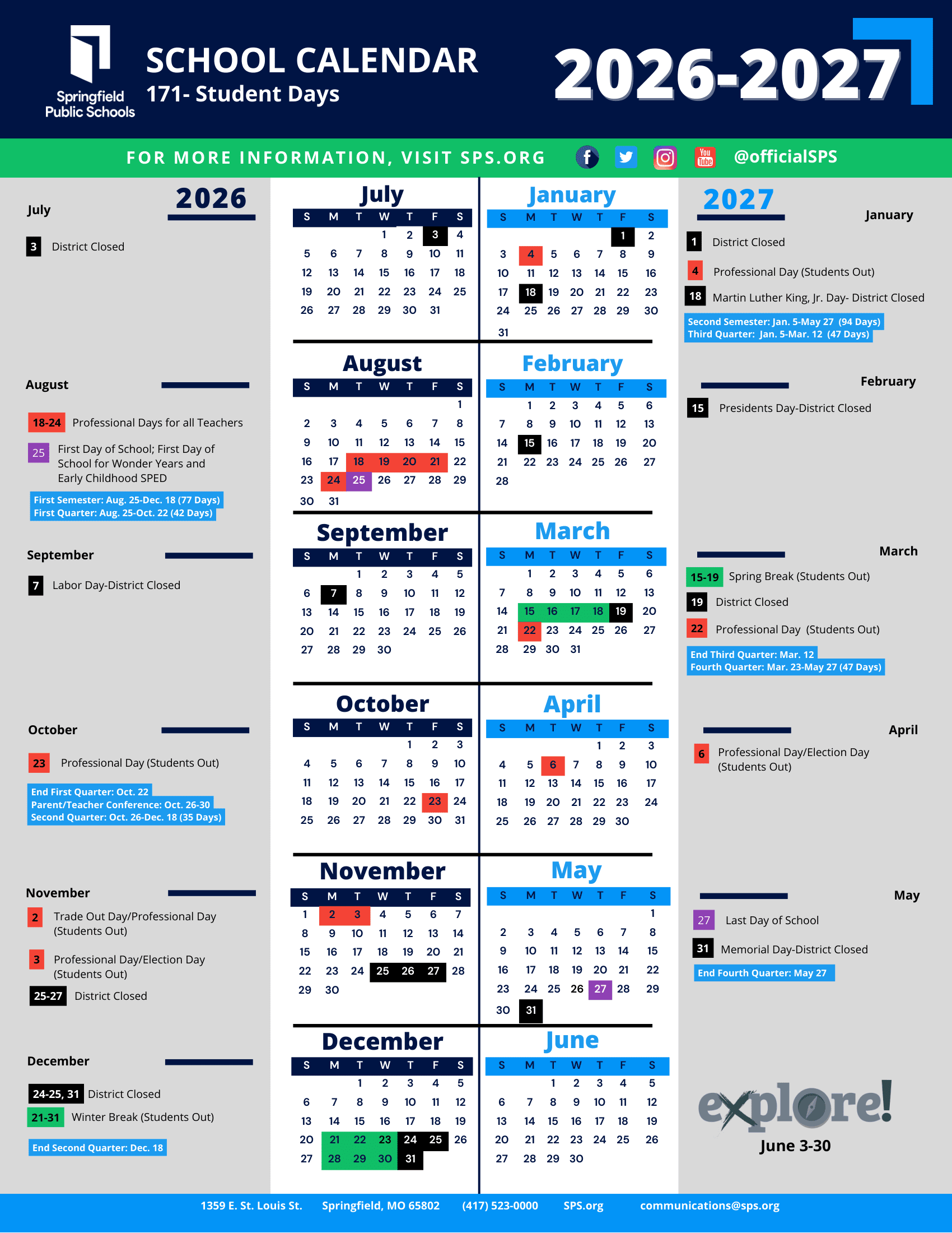 Dates are sourced from the official Springfield Public Schools 26-27 Calendar [REVISED] website. Dates may change at the discretion of the district. Always verify with the official school website for the latest updates.
