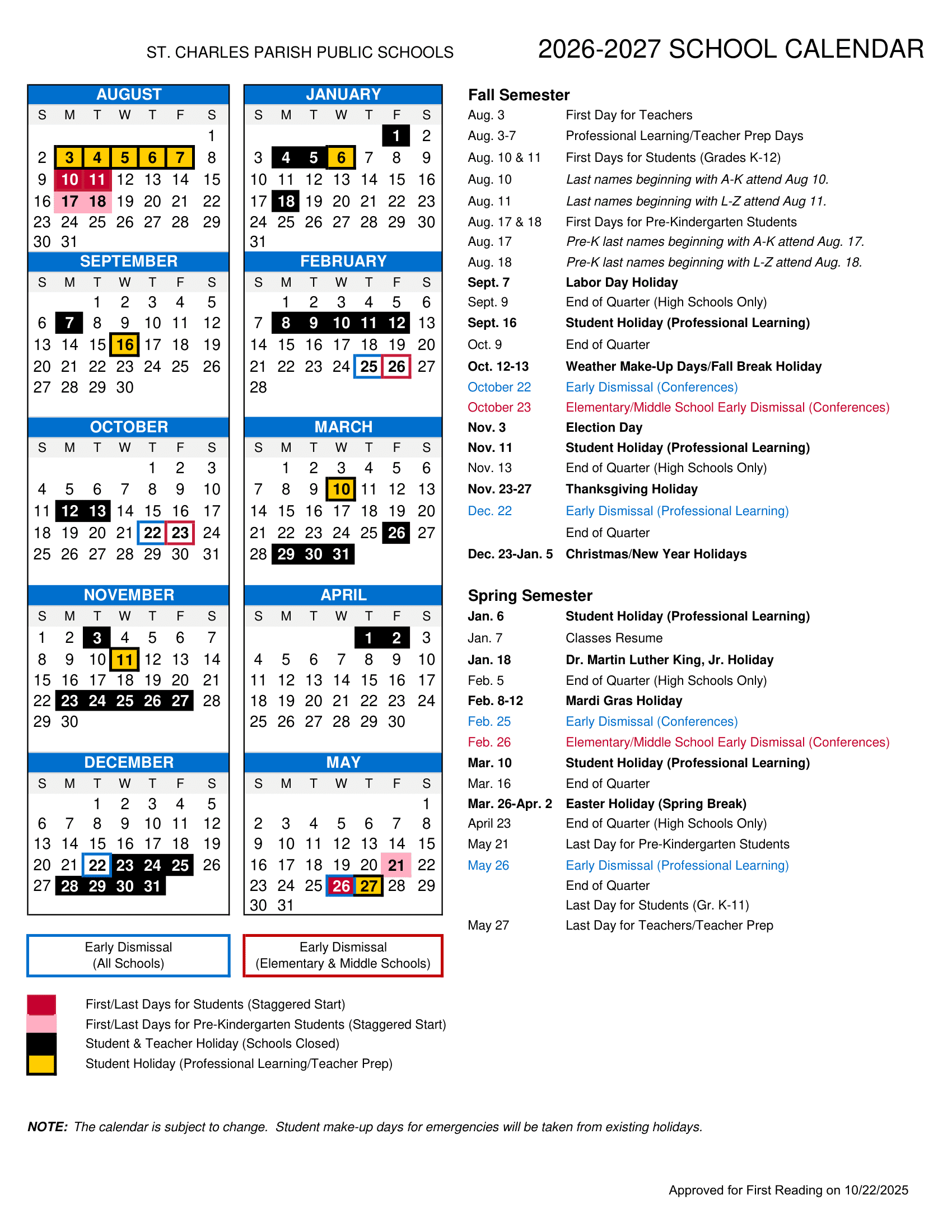Dates are sourced from the official St. Charles Parish Public Schools Calendar 26-27 Revised [PDF] website. Dates may change at the discretion of the district. Always verify with the official school website for the latest updates.