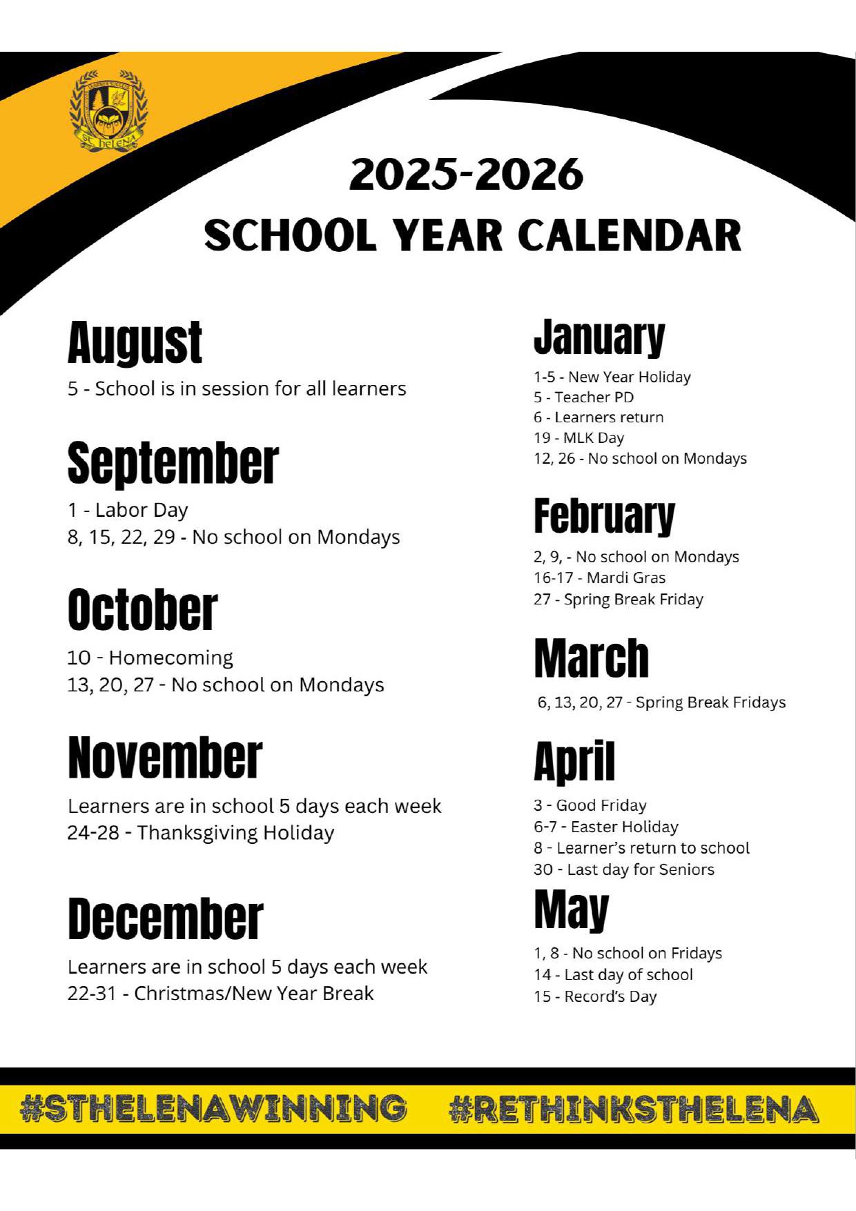 St. Helena School Calendar (2025-2026)