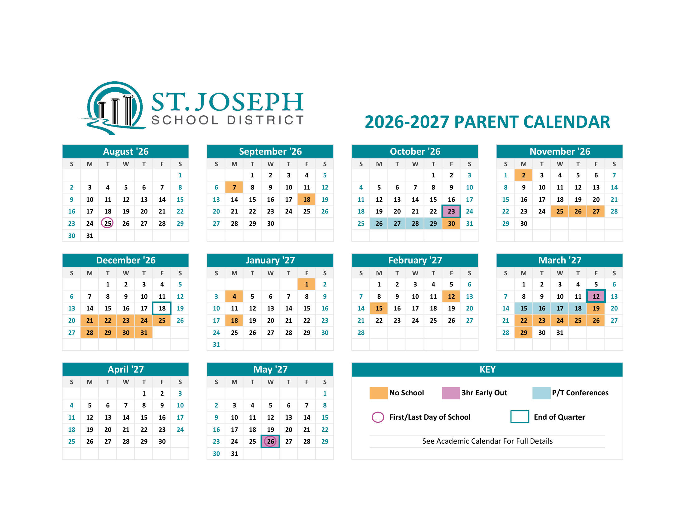 Dates are sourced from the official St. Joseph School District 26-27 Calendar Revised website. Dates may change at the discretion of the district. Always verify with the official school website for the latest updates.