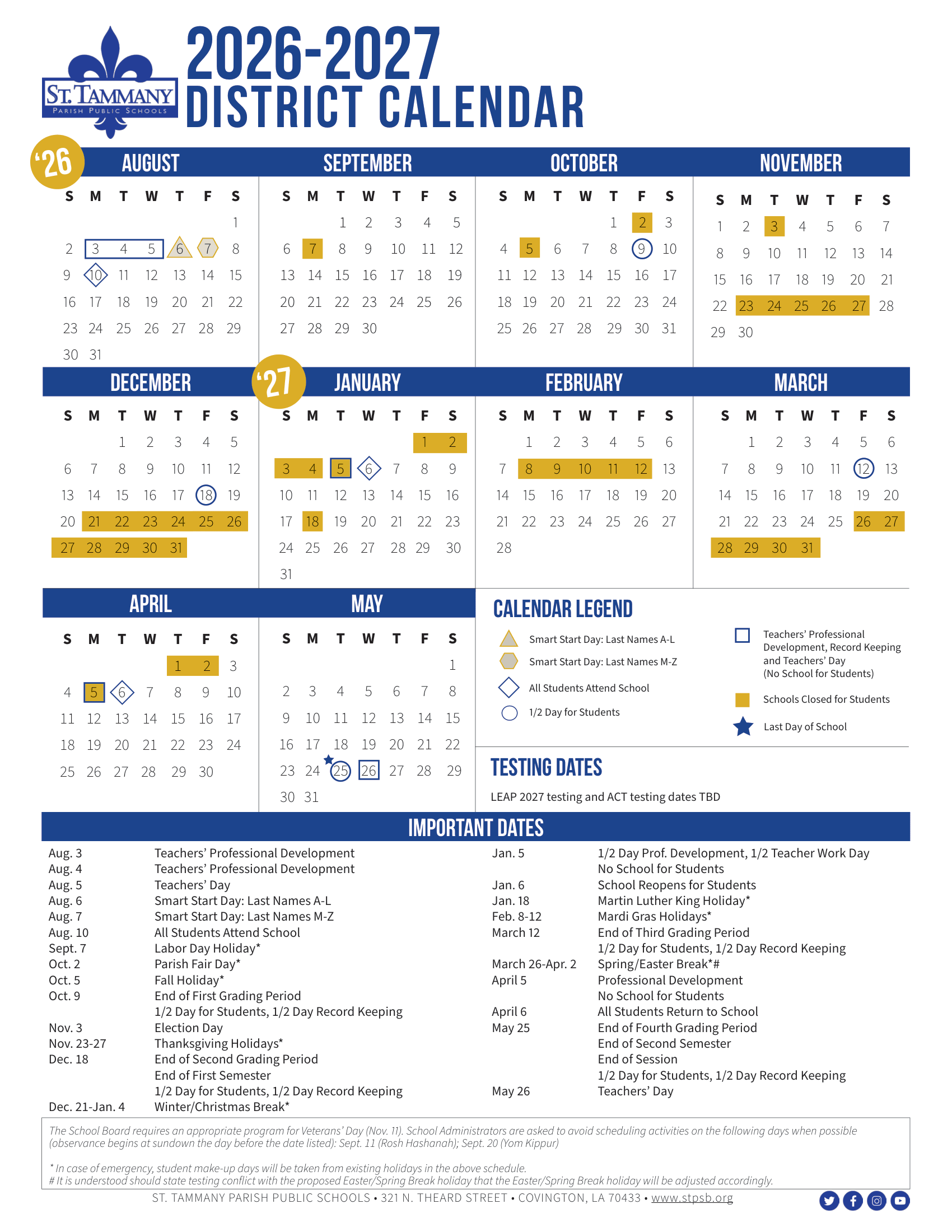 Dates are sourced from the official St. Tammany Parish Public Schools Calendar 26-27 Revised [PDF] website. Dates may change at the discretion of the district. Always verify with the official school website for the latest updates.