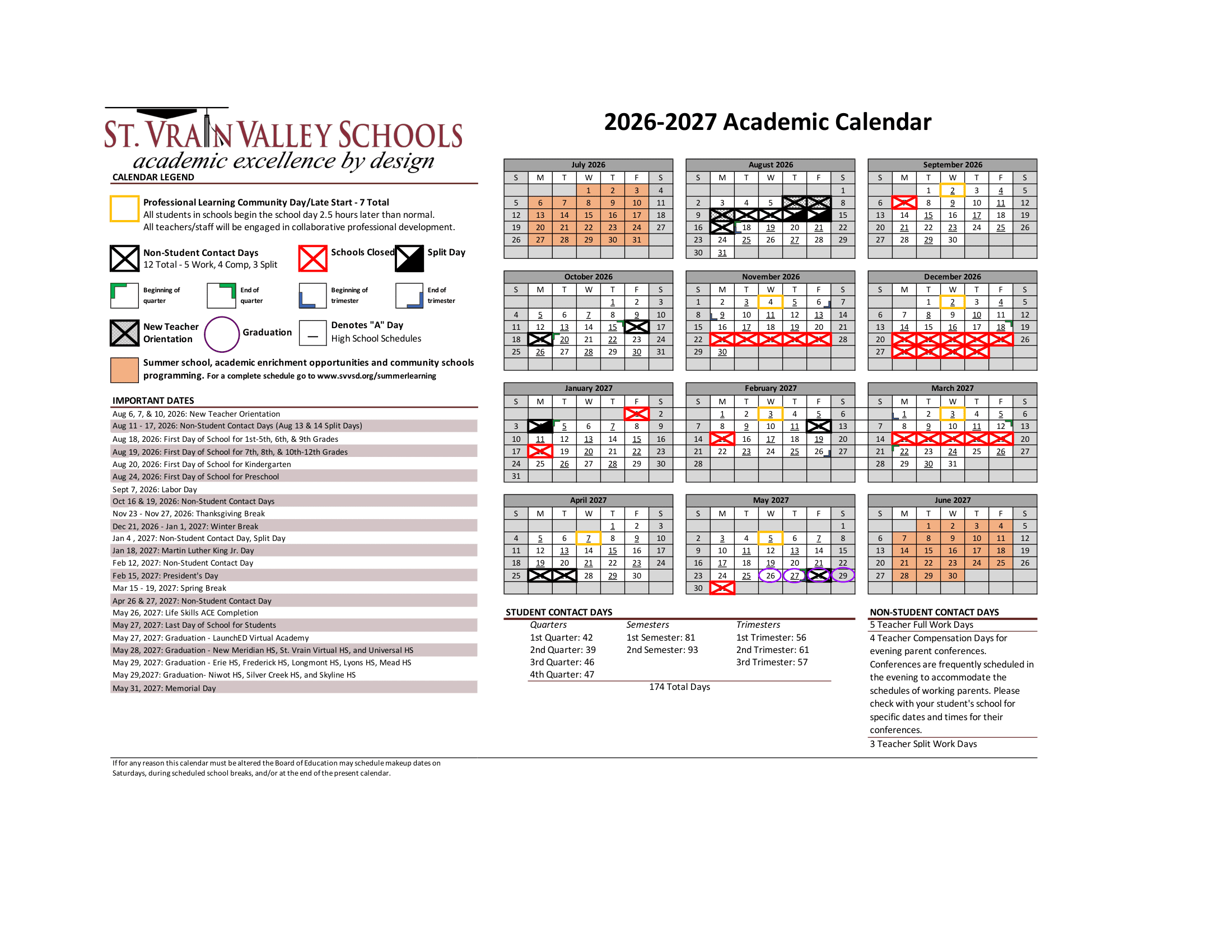Dates are sourced from the official St. Vrain Valley Schools 26-27 Calendar Updates website. Dates may change at the discretion of the district. Always verify with the official school website for the latest updates.