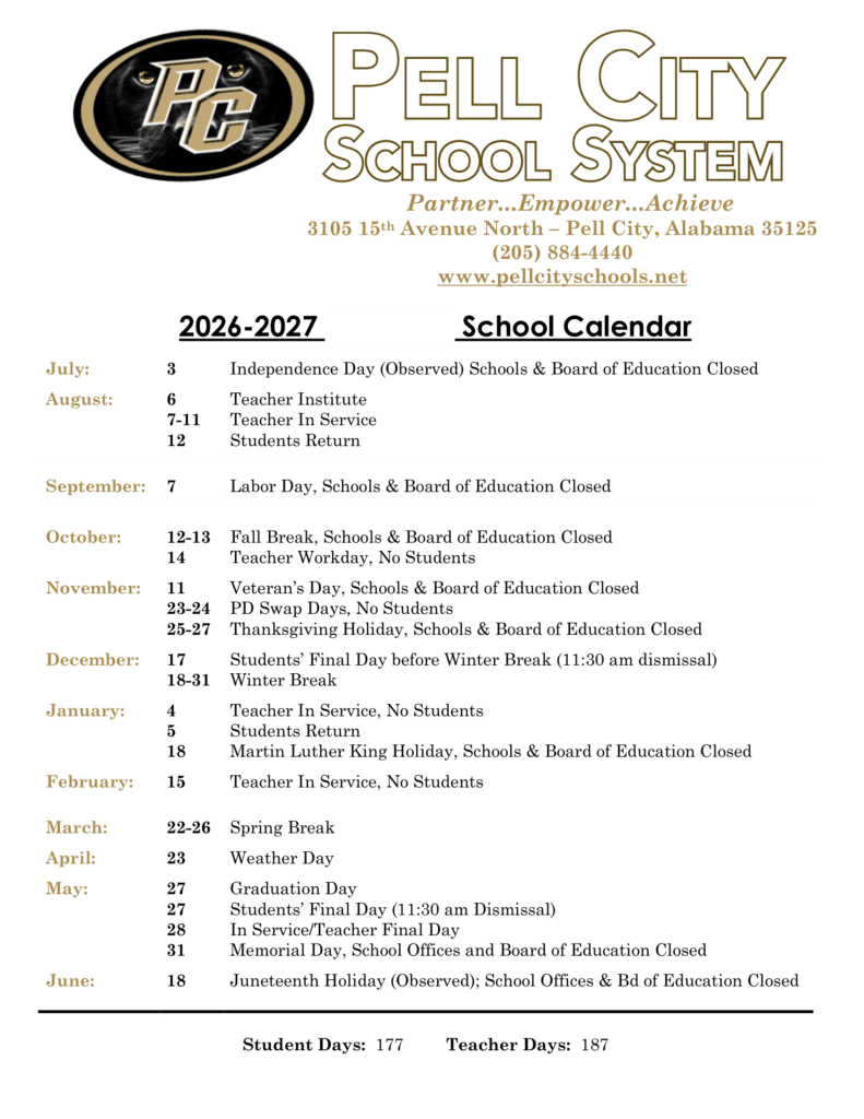 Tuscaloosa County School System 26-27 Calendar