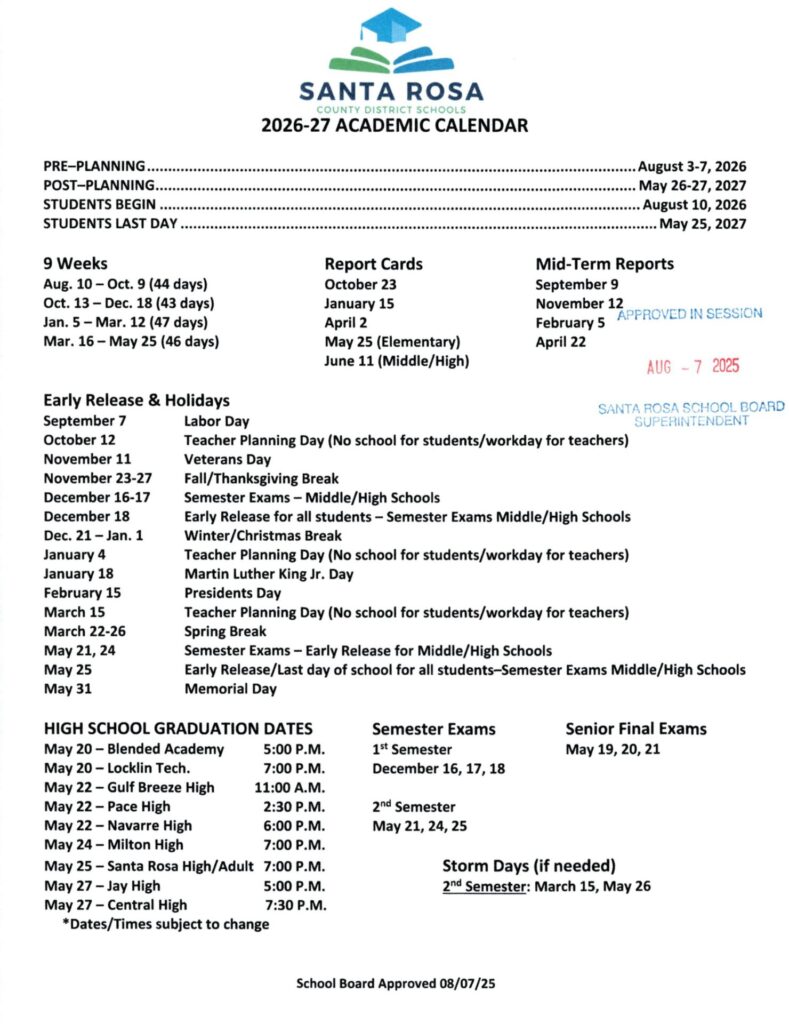 Santa Rosa County District Schools Calendar 26 27 Updated (PDF)