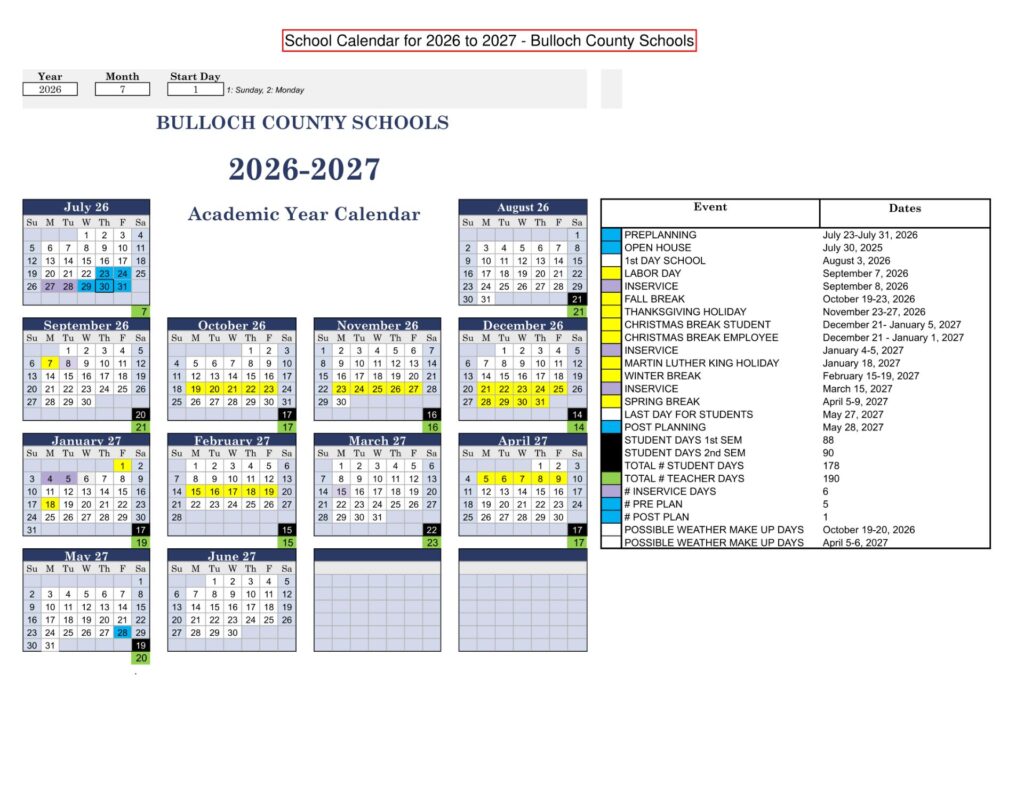 Bulloch County Schools GA Calendar 26-27 Calendar Revised