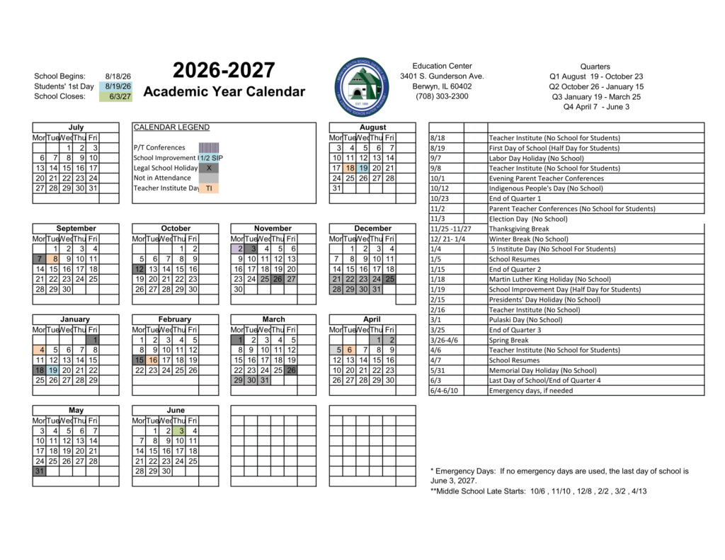 Berwyn South School District 100 Calendar 26/27 Updates