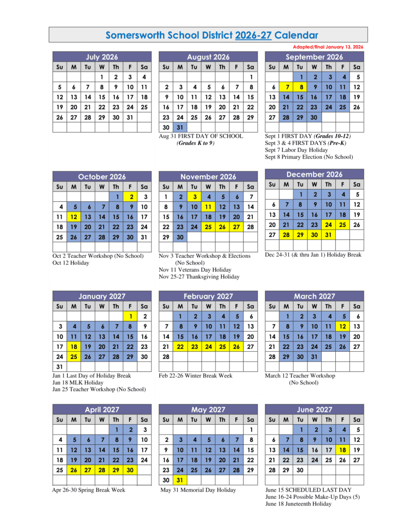 New Hampshire, School Calendars, StatesSouhegan Cooperative School District Calendar 26-27 Revised [PDF]