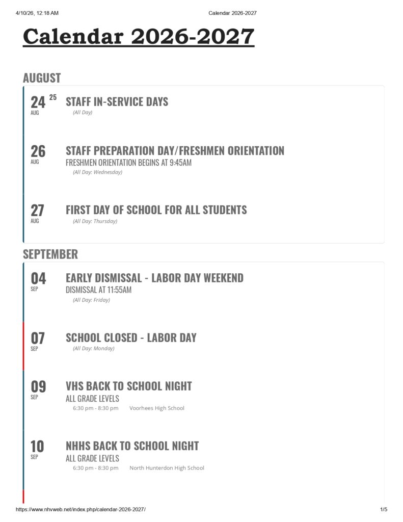 New Jersey, School Calendars, StatesNorth Hunterdon-Voorhees Regional High School Calendar 26-27 Updates