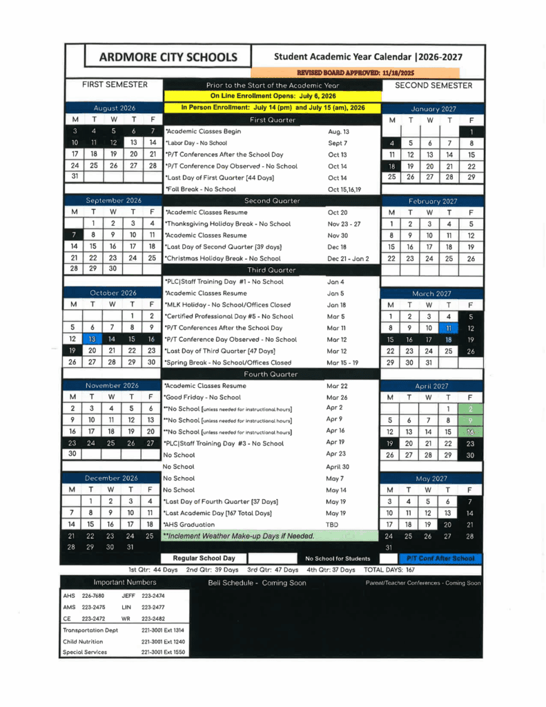 Ardmore City Schools OK 26-27 calendar Updates