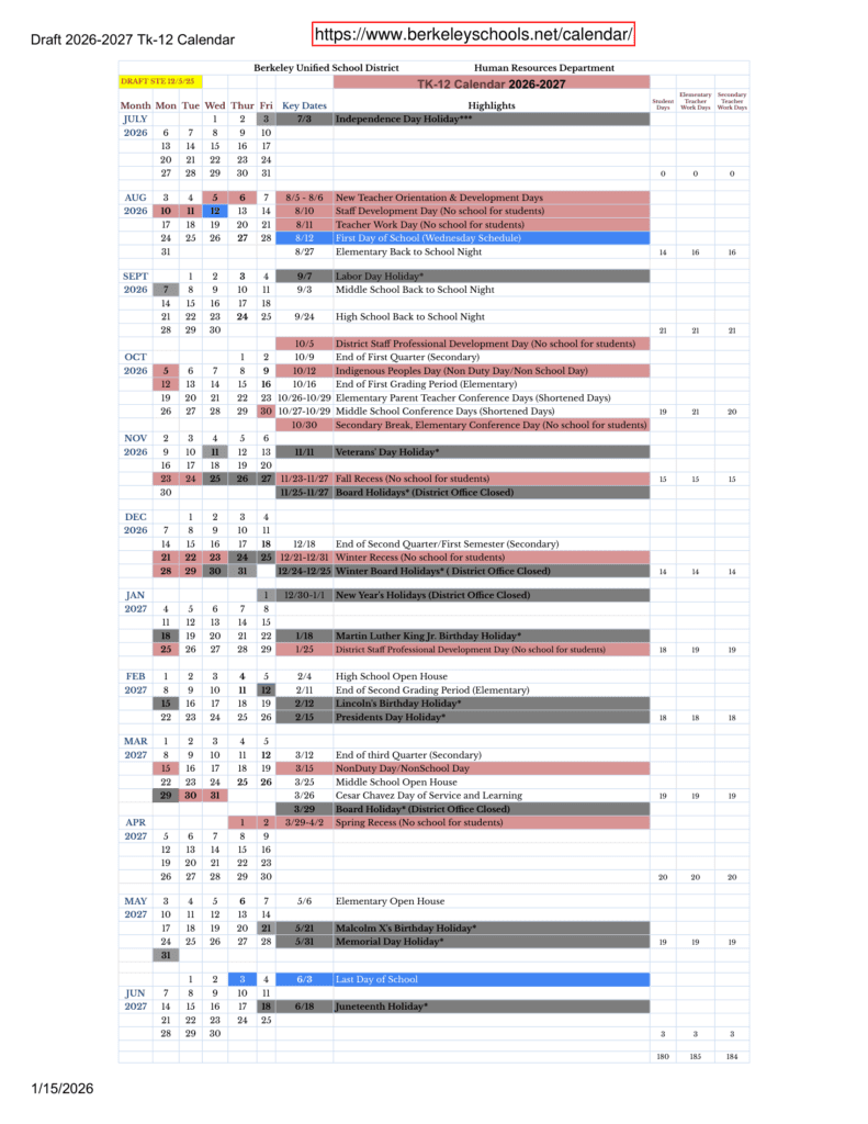 Berkeley Unified School District usd 26-27 Calender