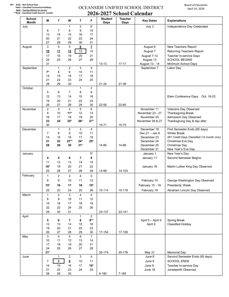 OCEANSIDE OUSD School Calendar 26-27 Revised [PDF]