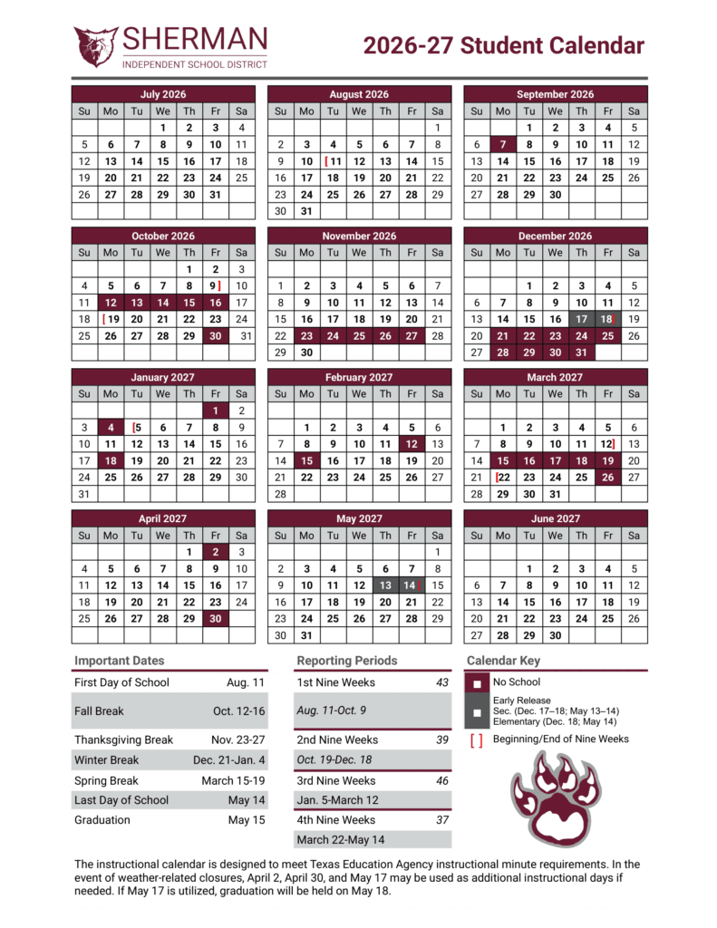 Sherman ISD 26-27 Calendar Revised [PDF]