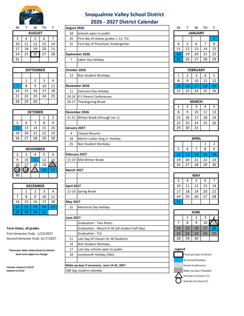 Snoqualmie Valley School District 26-27 Calendar Revised [PDF]
