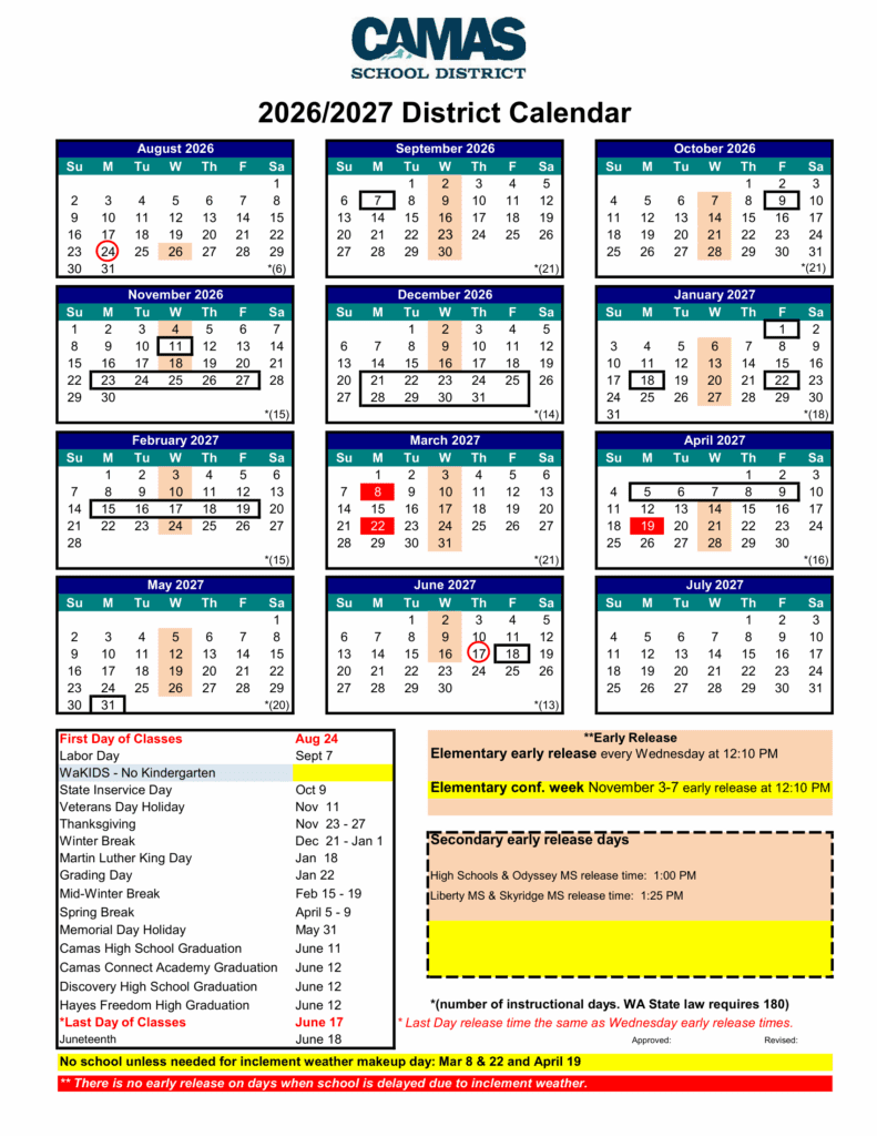 Camas School District 26-27 Calendar Revised [PDF]
