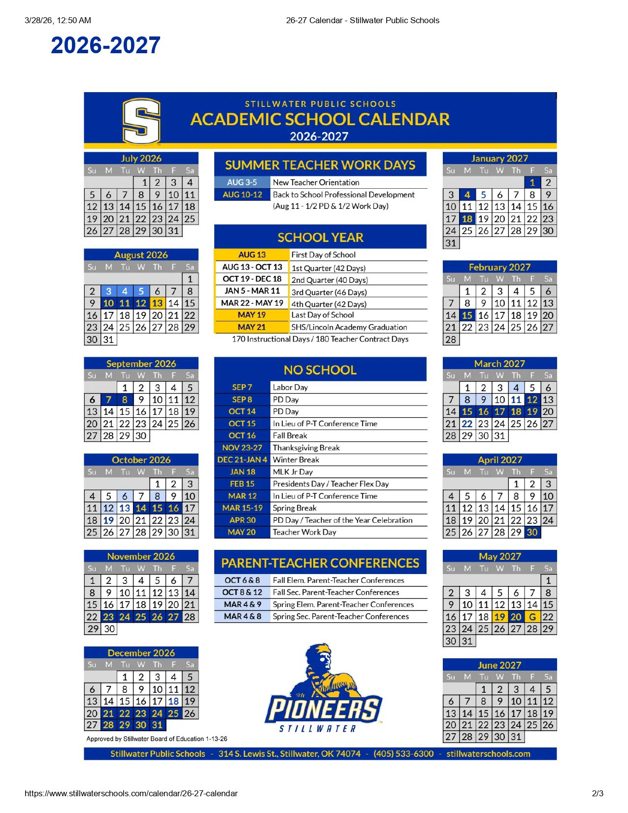 Dates are sourced from the official Stillwater Public Schools OK Calendar 26-27 Updates website. Dates may change at the discretion of the district. Always verify with the official school website for the latest updates.