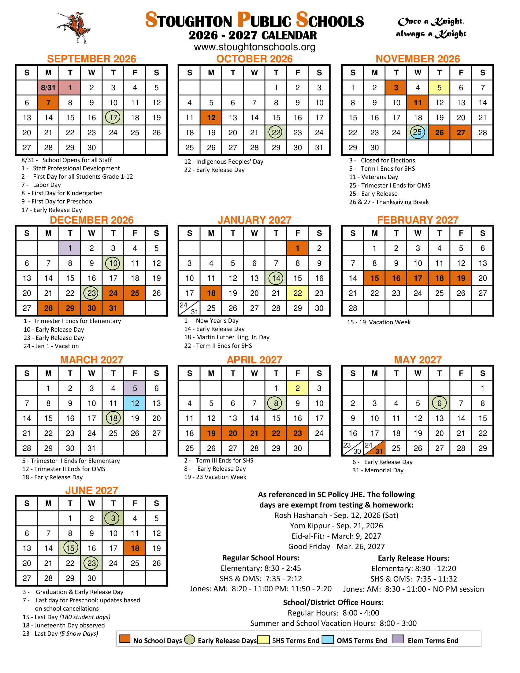 Dates are sourced from the official Stoughton Public Schools MA Calendar 26-27 Revised [PDF] website. Dates may change at the discretion of the district. Always verify with the official school website for the latest updates.
