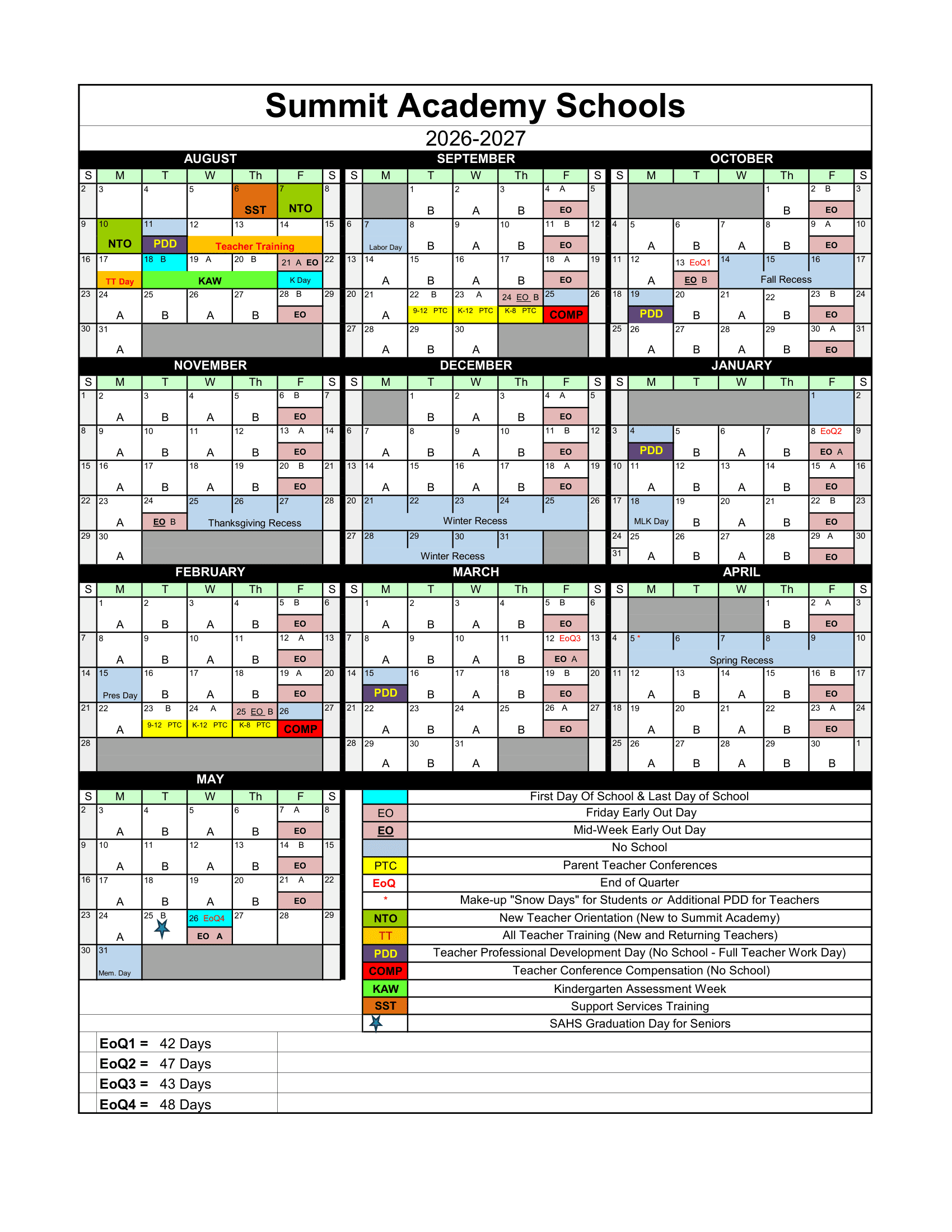 Dates are sourced from the official Summit Academy Schools 26-27 Calendar Revised [PDF] website. Dates may change at the discretion of the district. Always verify with the official school website for the latest updates.