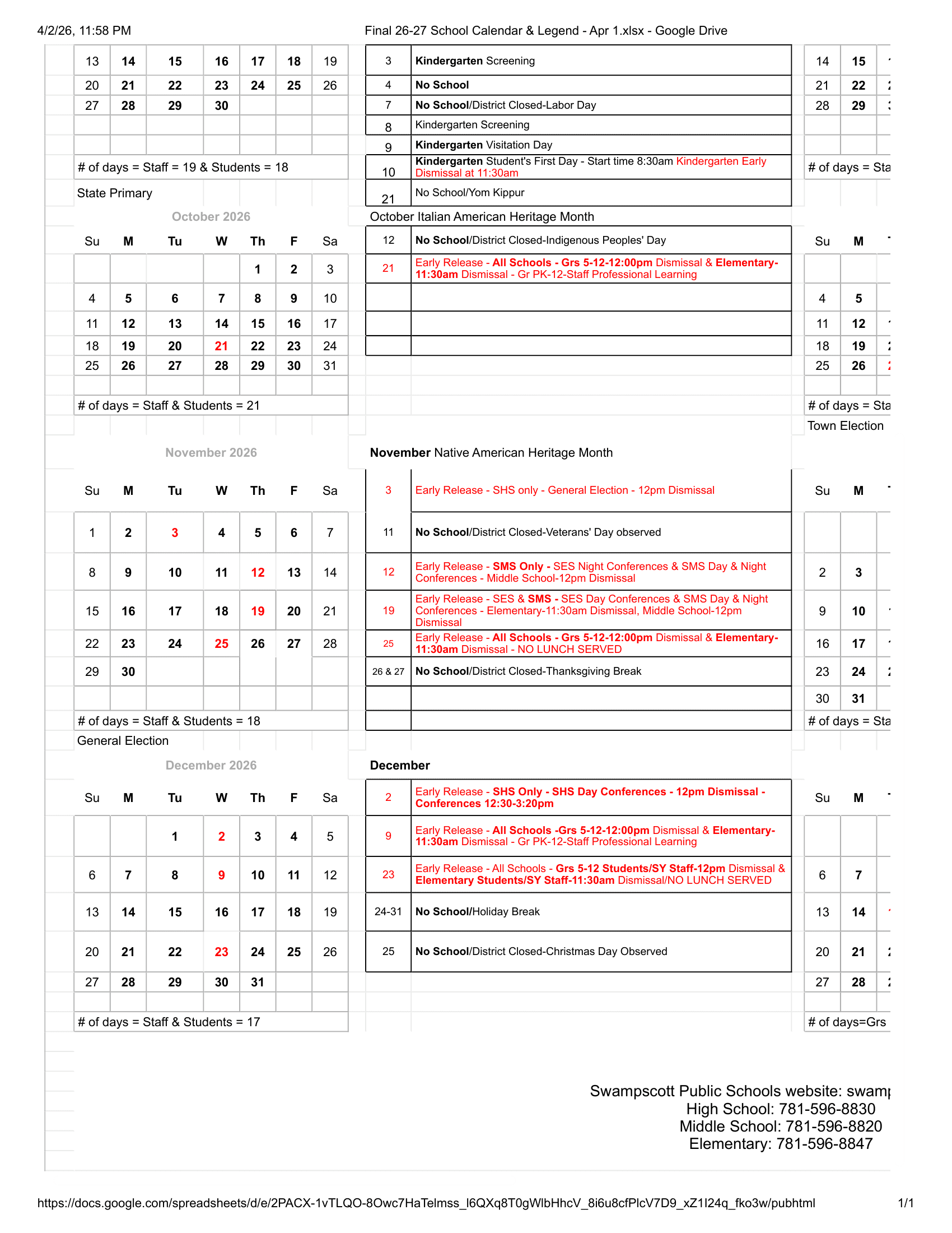 Swampscott Public Schools Calendar 26-27 Revised [PDF]