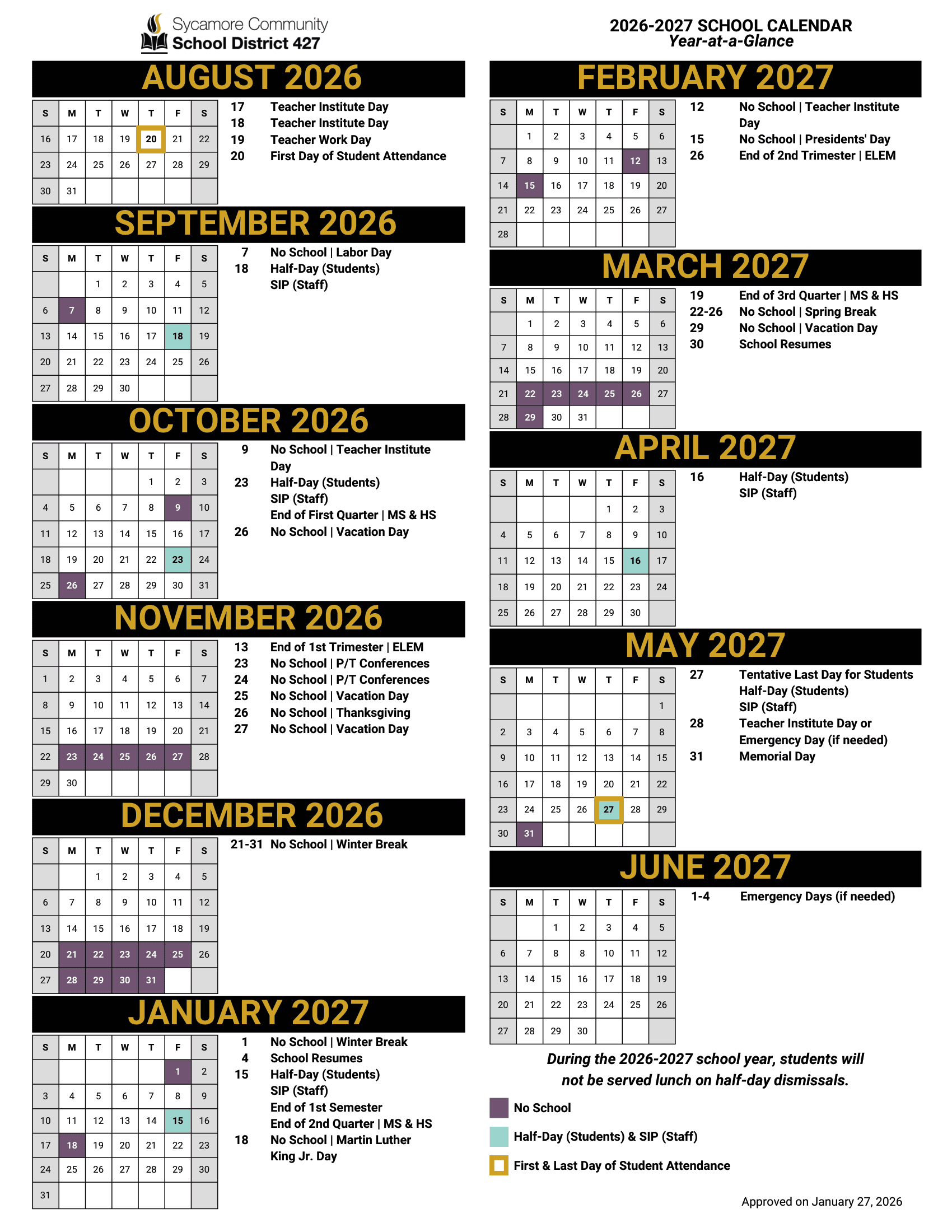 Dates are sourced from the official Sycamore Community School District SYC427 Calendar 26-27 [PDF] website. Dates may change at the discretion of the district. Always verify with the official school website for the latest updates.