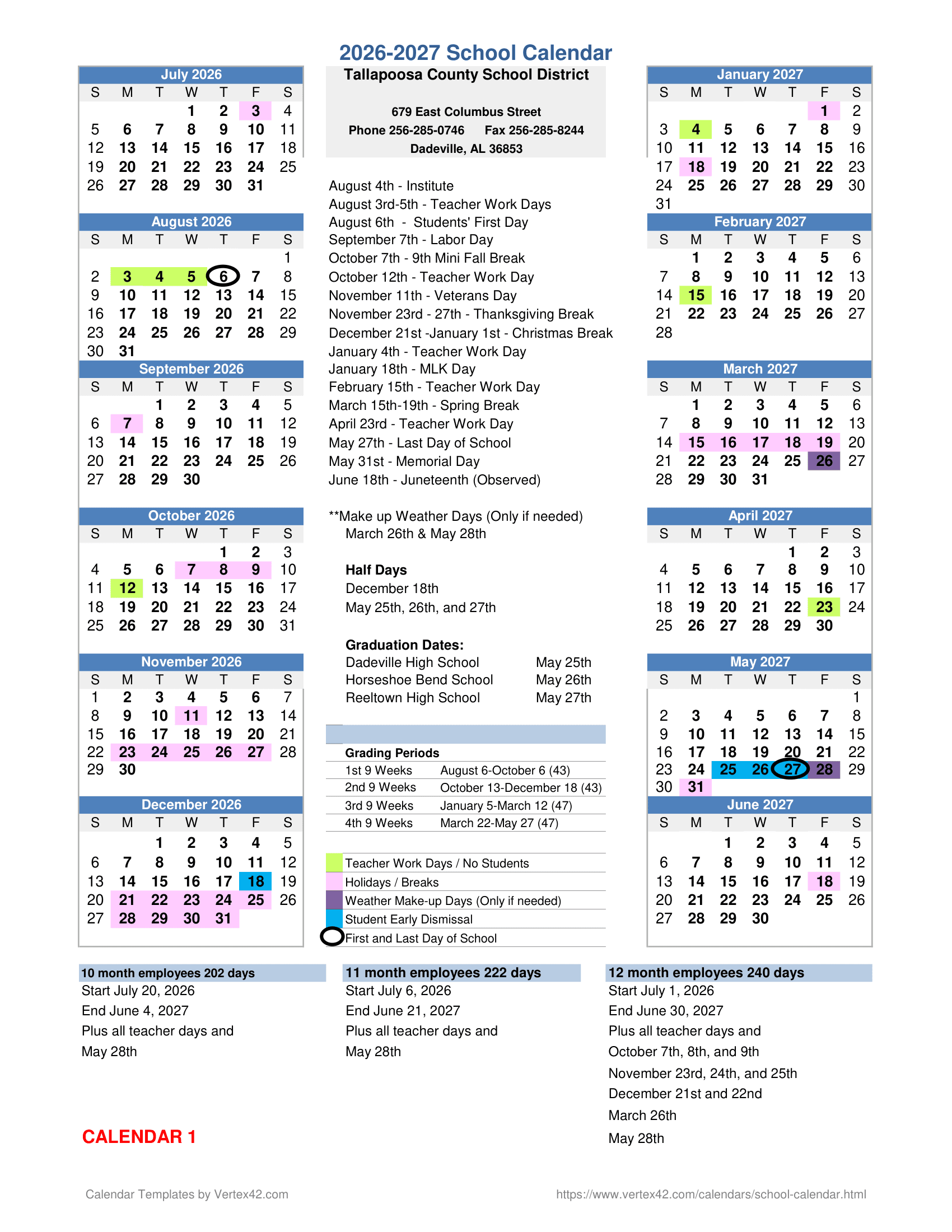 Dates are sourced from the official Tallapoosa County School District AL 26-27 Calendar [PDF] website. Dates may change at the discretion of the district. Always verify with the official school website for the latest updates.