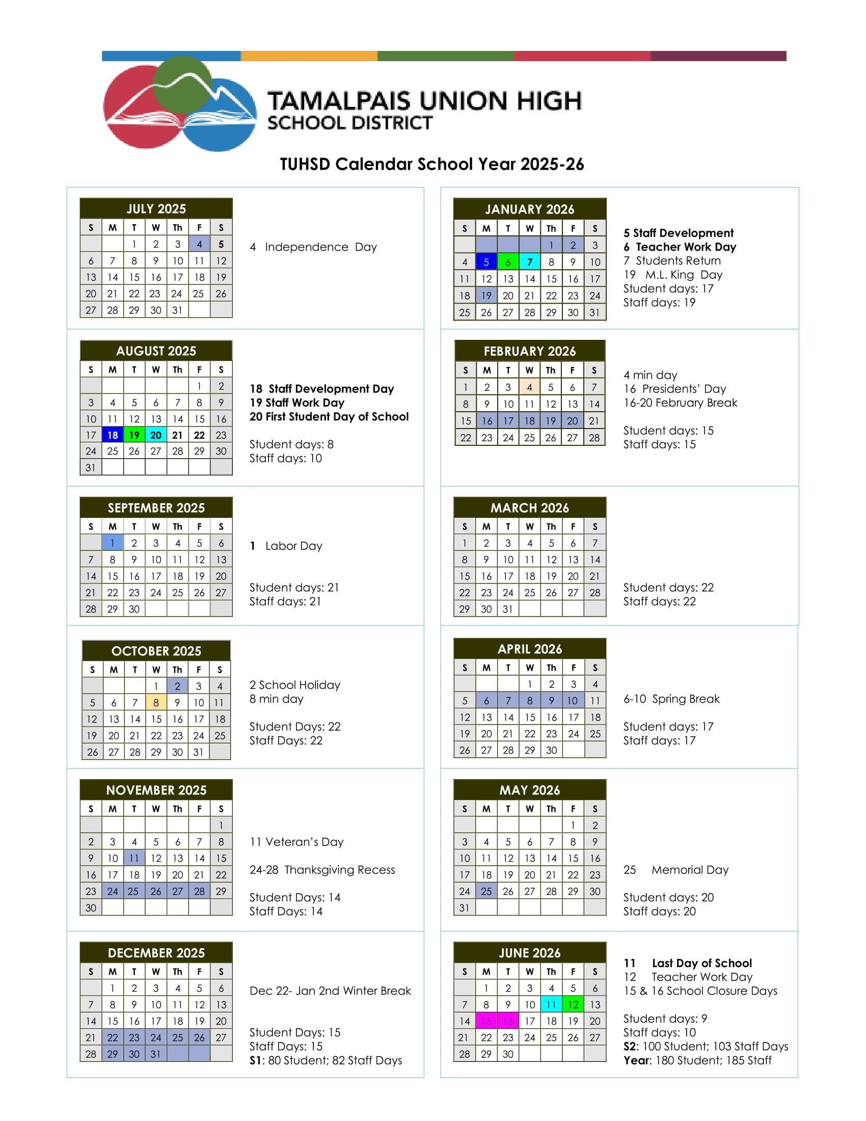 TAMALPAIS UNION HIGH SCHOOL DISTRICT Calendar (2025-2026)