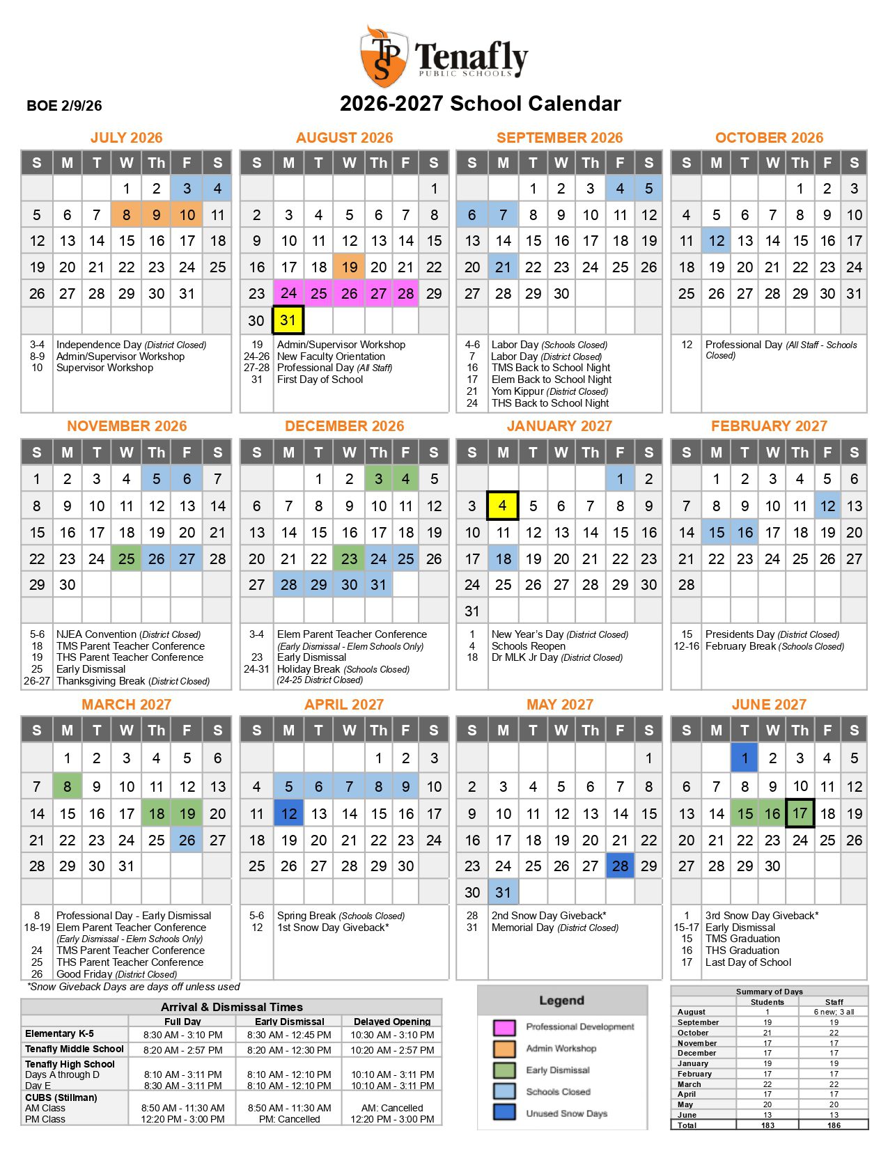 Dates are sourced from the official Tenafly Public Schools Calendar 26-27 Updates website. Dates may change at the discretion of the district. Always verify with the official school website for the latest updates.