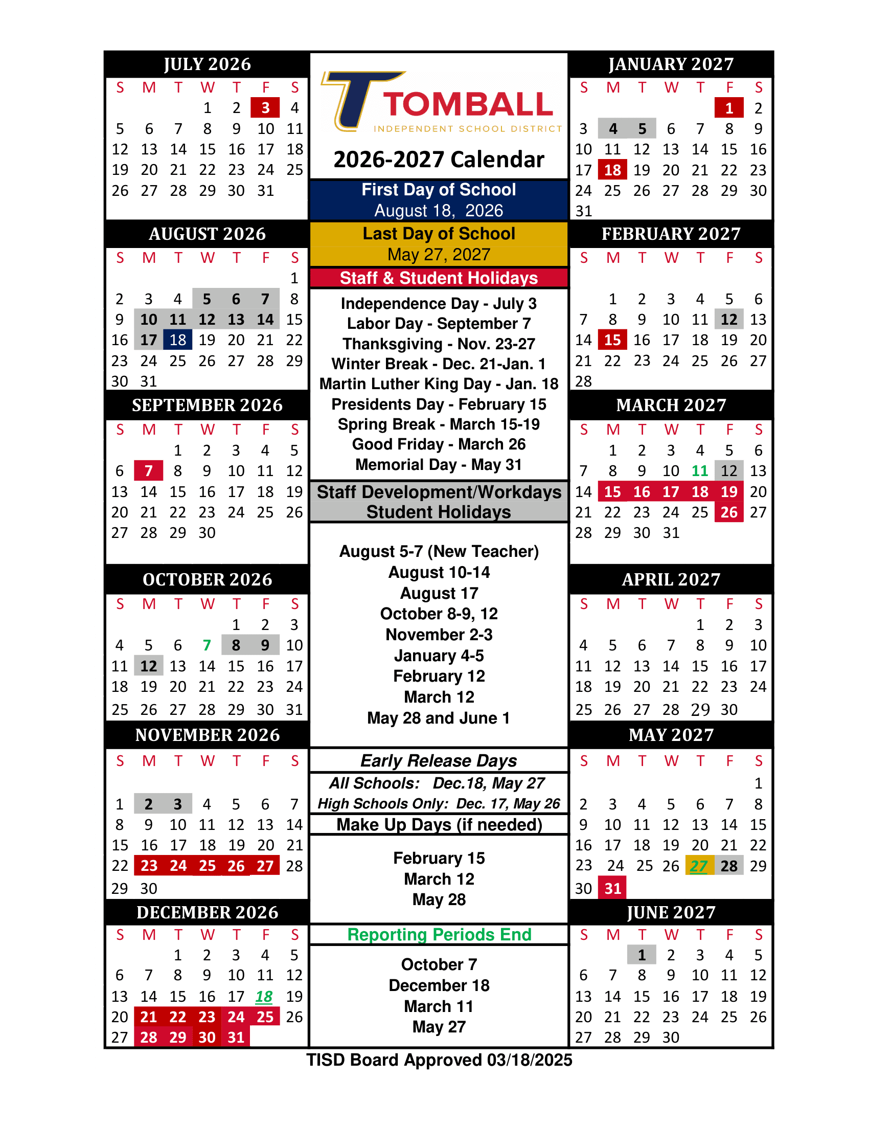 Dates are sourced from the official Tomball Isd Calendar 26-27 Calendars [PDF] website. Dates may change at the discretion of the district. Always verify with the official school website for the latest updates.