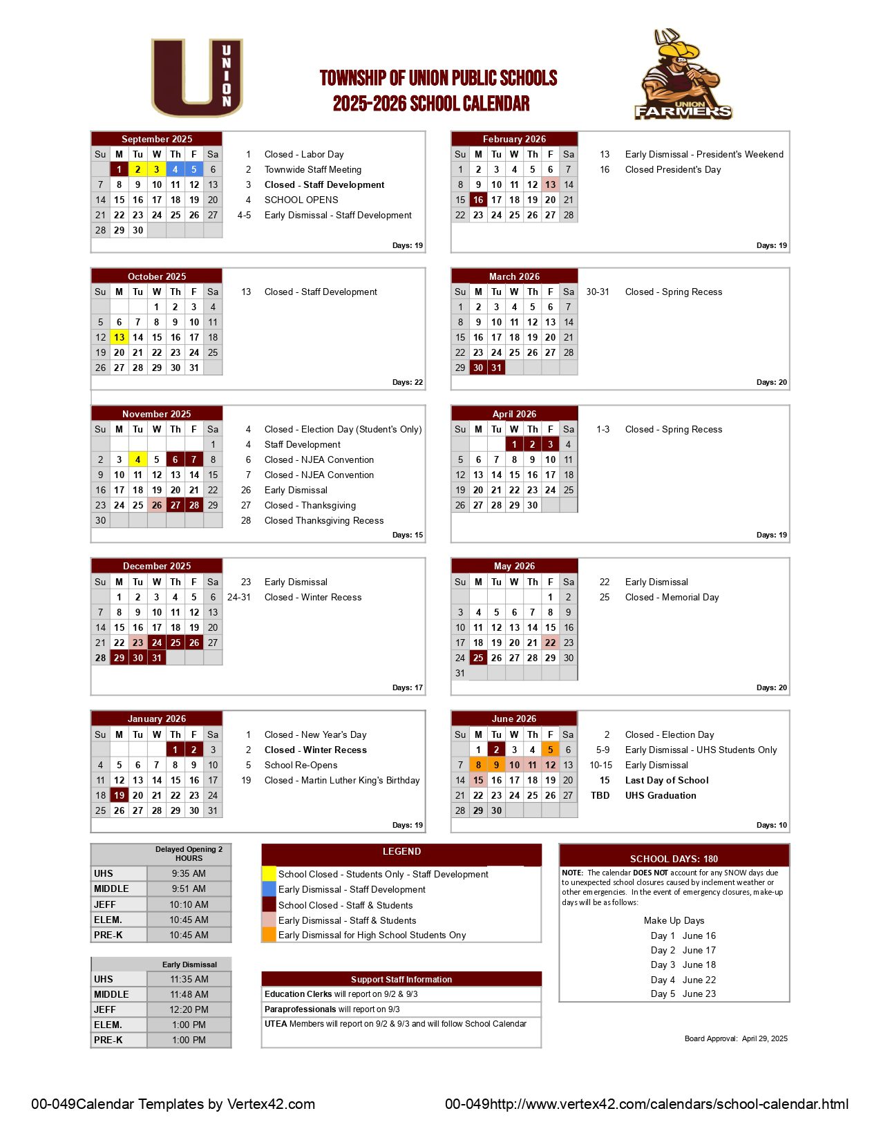 UNION TOWNSHIP OF UNION PUBLIC SCHOOLS Calendar (2025-2026)